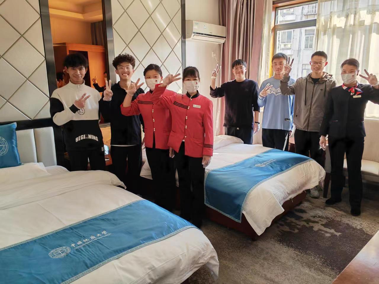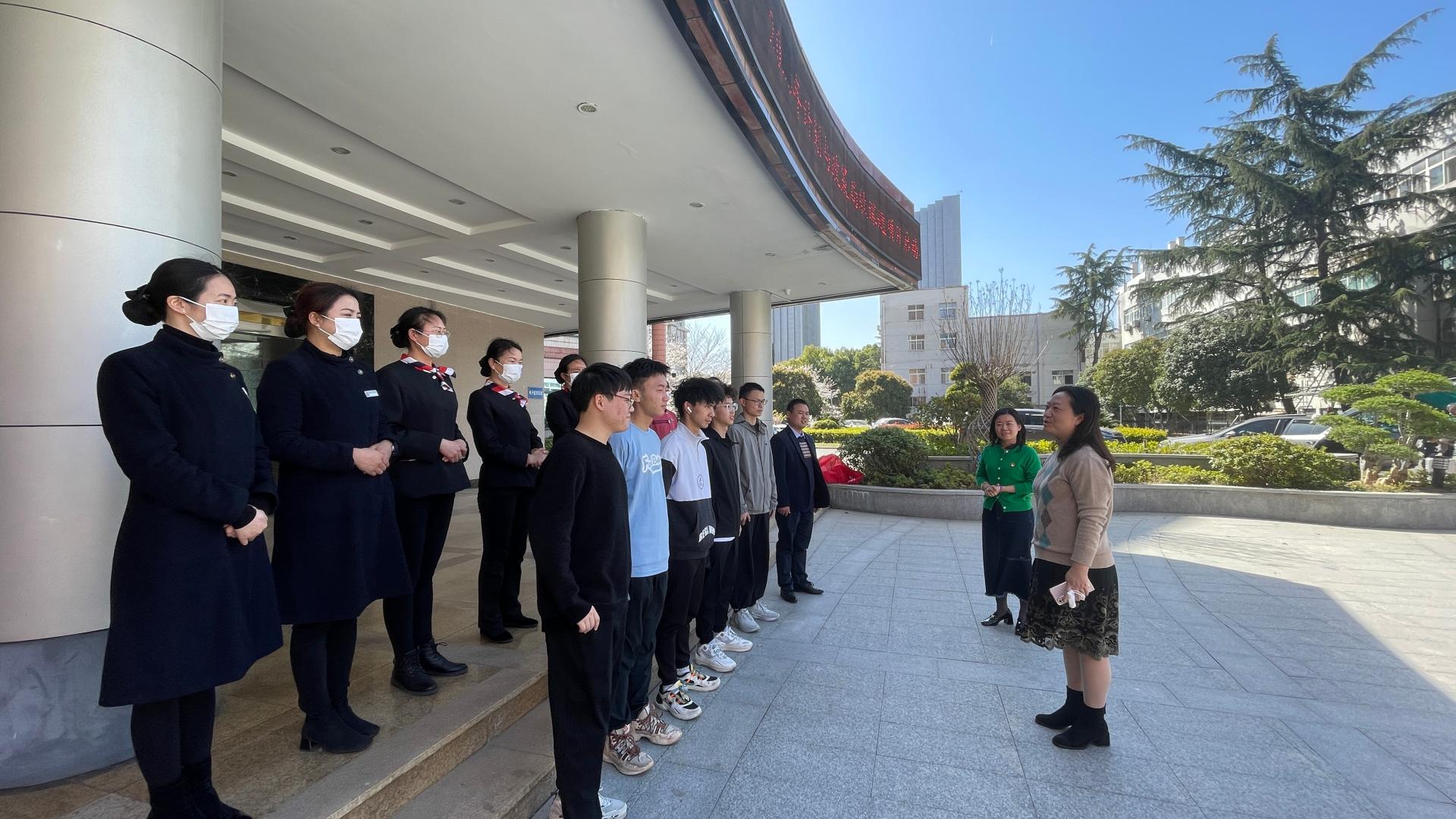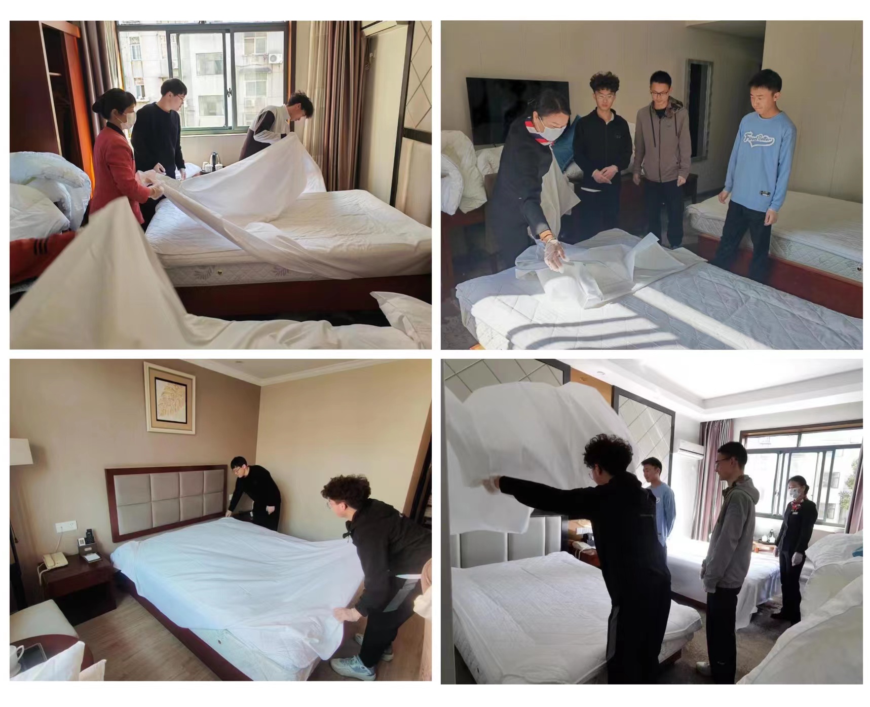 实践部分,由楼层班长郭雪梅及工作人员带领同学们走进迎宾楼客房区域,向同学们介绍了工作间布局,讲解了布草车用途。进入房间后,工作人员向同学们讲解了整个房间清扫的工作流程,进行了铺床步骤展示,并指导同学们动手尝试和操练。