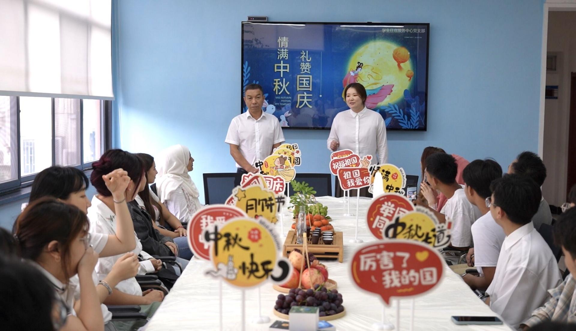 正逢中秋、国庆“双节”来临之际,为赓续红色基因,传承发扬中华优秀传统文化,营造祥和喜庆节日氛围,后勤党委学生住宿服务中心党支部与资源学院红星学生园区团支部开展“迎中秋、庆国庆”结对领航活动,并特别邀请15名留学生参加,共迎中秋之月、共庆大国华诞。本次活动得到了资源学院、国际教育学院的大力支持。