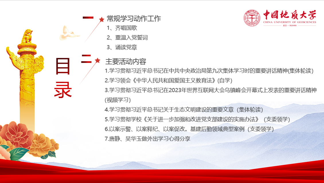 本月“支部主题党日”活动的主题为“心怀家国担使命 美丽中国建新功”。根据活动议程,全员轮读学习《贯彻习近平总书记在中共中央政治局第九次集体学习时的重要讲话精神》《贯彻习近平总书记关于生态文明建设的重要文章》;全员集中观看视频《学习贯彻习近平总书记在2023年世界互联网大会乌镇峰会开幕式上发表的重要讲话精神》。