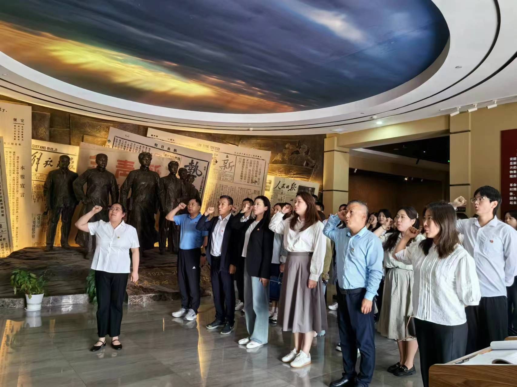 走进报刊博物馆,首先映入眼帘的是一组革命先烈雕像群组。在革命先烈雕像下,党员们面向党旗庄严肃立、举起右拳,以铿锵有力的声音庄严宣誓,重温入党誓词。