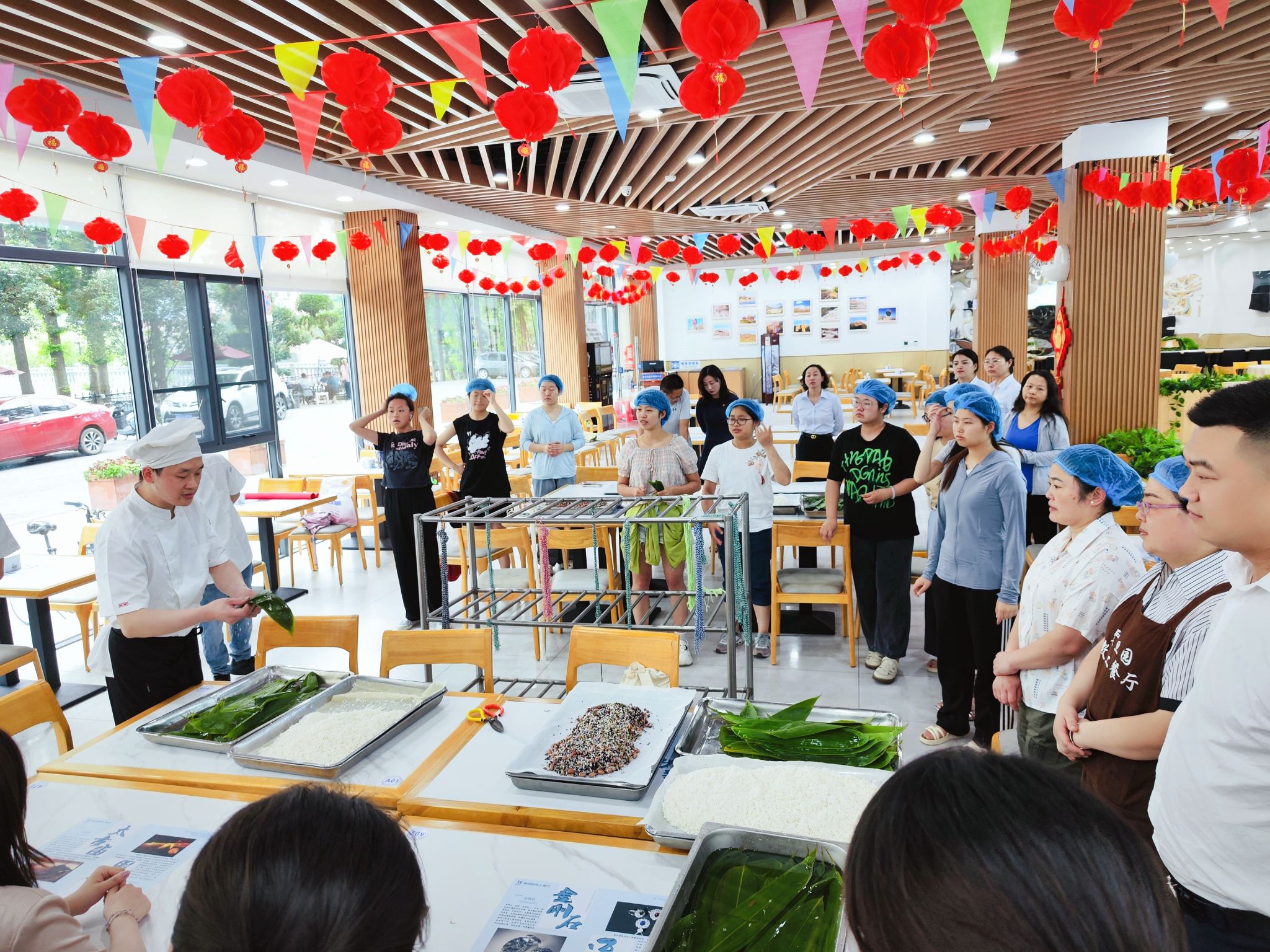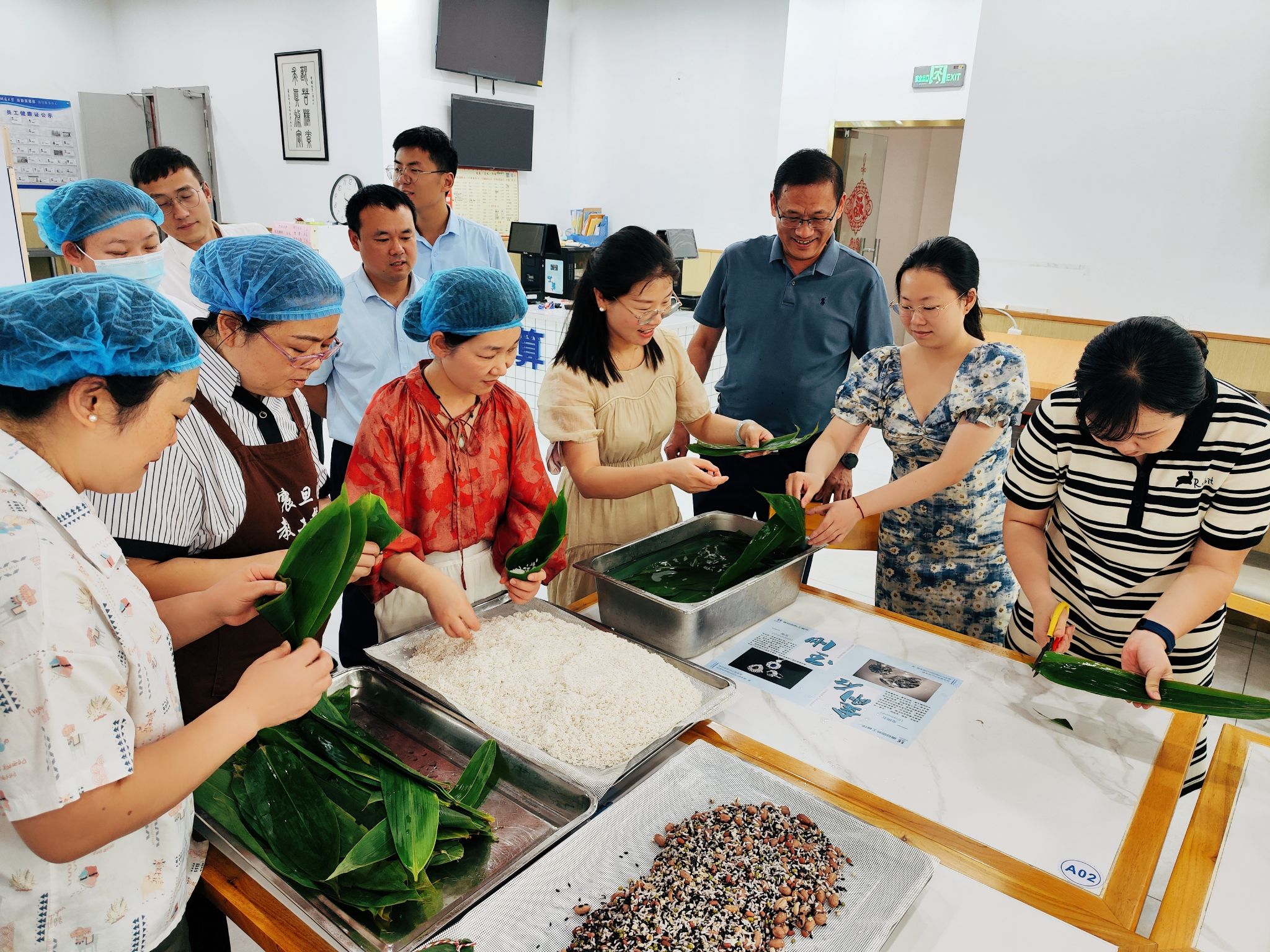 6月6日,支部联合部机关党支部、校公共管理学院学生在教工餐厅举办了端午节包粽子文化体验活动。活动现场灯笼摇曳、彩旗飘扬,节日氛围浓厚,在震旦园餐厅资深白案厨师许亮的讲解示范下,现场的大学生、党员们拿起一片片粽叶,包裹浸泡好的糯米,一卷一叠,用五彩绳扎紧,一个个形状各异的玲珑粽子就展现在大家面前了。“端午节,是我国四大传统节日之一,具有深厚的历史文化底蕴,更是我们中华民族传承千年的文化符号。包粽子,作为端午节的重要习俗之一,蕴含了浓浓的团圆和亲情。今天,我们组织这个活动,不仅是为了庆祝端午佳节,更是为了弘扬和传承我们的传统文化。”部机关党支部书记董海伦激动地表示。