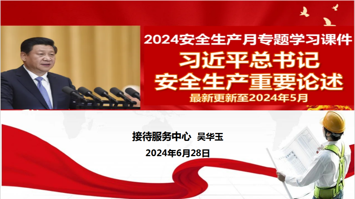 为积极响应2024年安全生产月活动精神,吴华玉同志深入讲解习近平总书记关于安全生产重要论述,中心全体党员、入党积极分子和副经理以上人员参加学习。她从2013年-2024年5月期间发生的重大安全事故案列及习近平总书记对于安全生产做出的重要指示精神进行逐一深入剖析,讲述了习近平总书记关于安全生产中论述的六大要点,提出要从“意识、体系、责任、监管、机制、担当”六方面入手,要始终把安全生产放在首要位置,坚持底线思维。她强调,安全生产决不能以人的性命为代价,与会人员要严守生命安全红线,中心生产部门要加强安全隐患的排查,避免安全生产事故发生。随后大家集中观看2024年安全生产月活动关于“畅通生命通道”的宣传片。