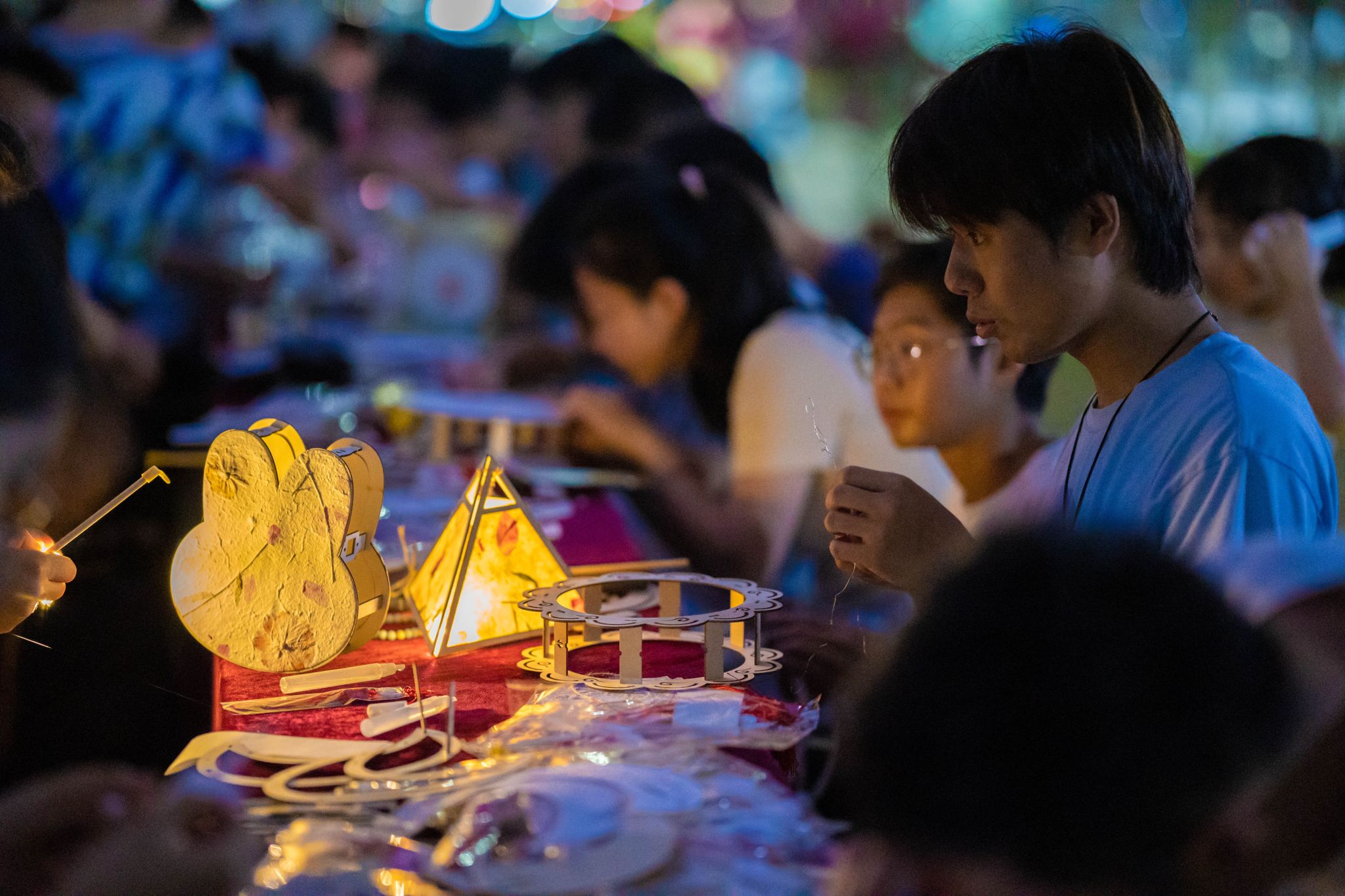 活动现场,大家分布在不同区域,沉浸其中。我国民间自古以来就有中秋举办灯会的习俗,与中秋赏月、品尝月饼等习俗一并,成为中秋节丰富多彩活动的一项,表达着人们对生活的美好祝愿。穿吊绳、挂吊穗、缠灯线、粘花饰……,党员同志和结对共建学生们充分发挥自己的想象力和创意,一盏盏饱含中秋元素、样式各异的手工花灯逐渐亮相。花环中央“绽放”的莲花,清新淡雅;憨态可掬的“玉兔”让人忍俊不禁,为花灯增添了灵动。轻触开关,流光溢彩的花灯,为整个活动现场平添了温馨浪漫的节日氛围。看着亲手制作的花灯,大家喜上眉梢、乐在心头,纷纷拿出手机拍照留念,记录这一难忘时刻。
