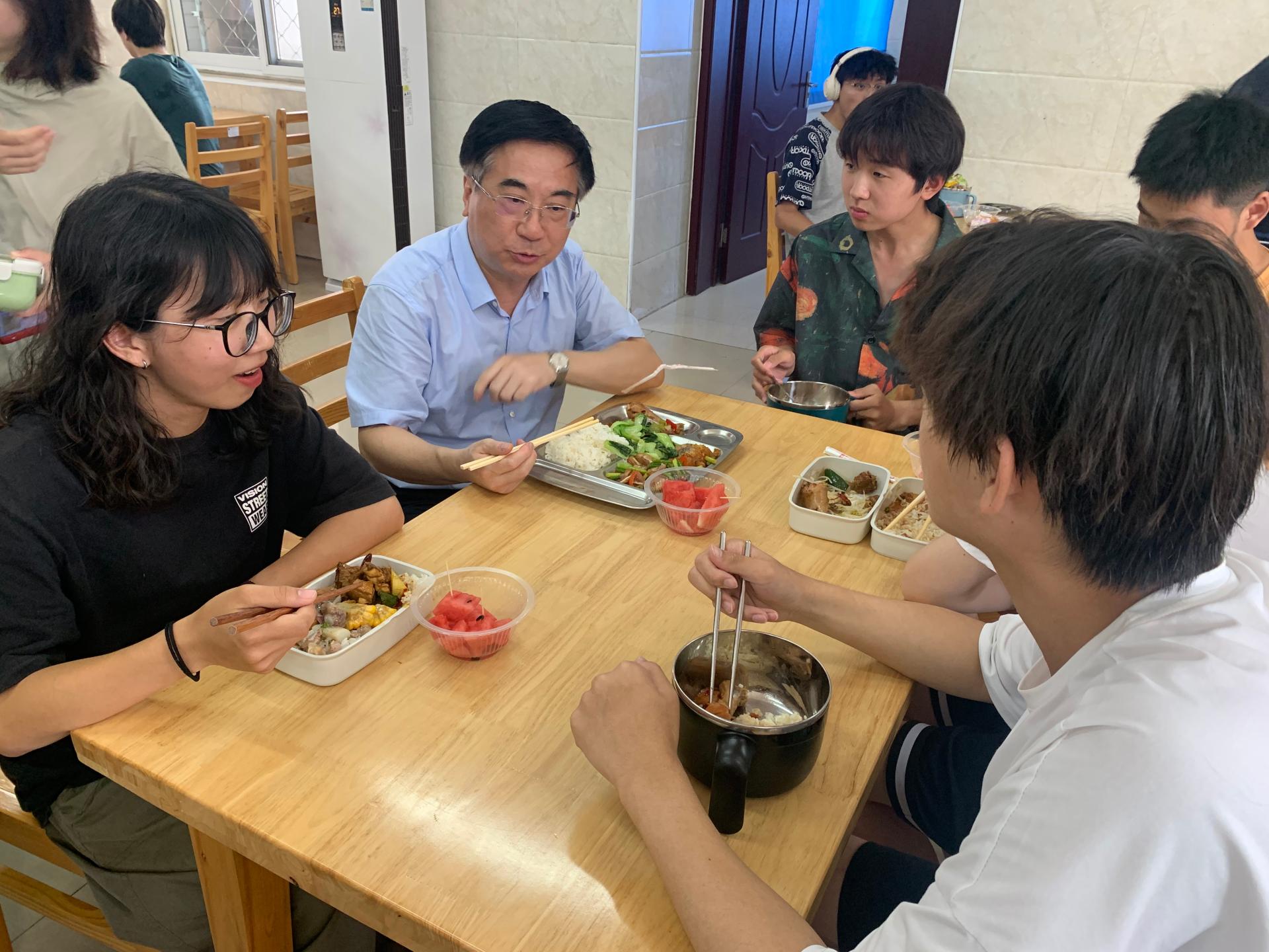 在学生食堂,王焰新、刘杰听取相关单位负责人汇报周口店科教基地升级改造情况,并就相关工程改造问题进行讨论。时至中午,王焰新及随行人员在基地食堂与学生一起排队打饭共进午餐,与学生亲切交谈,询问学生对伙食的意见,并鼓励学生们向老一辈地质工作者和科学家学习,扎实练好专业本领早日成才,为中华民族伟大复兴贡献力量。