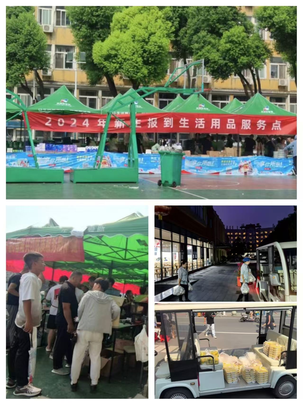 迎新期间,饮食服务中心设立免费饮品发放点,累计为全校师生、家长、工作人员送去免费饮品一万余杯;物业服务中心在教学楼张贴校园一张图、迎新导览二维码、迎新签名背景墙;学生住宿服务中心设置迎新休息区,免费开放楼内直饮水,用暖心行动展现对新生的满满关爱。