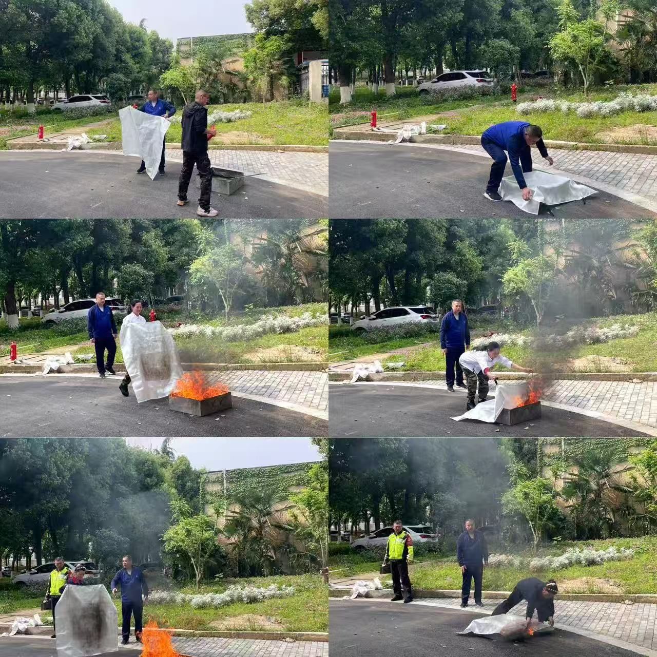理论学习后,全体参训人员前往演练场地开展实操训练。刘从贵现场示范干粉灭火器“提、拔、握、压”操作要领,明确操作距离、风向等关键要求,同时讲解灭火毯使用方法及注意事项。参训人员三人一组,依次实操扑灭模拟火源,严格遵循操作规范,现场秩序井然。