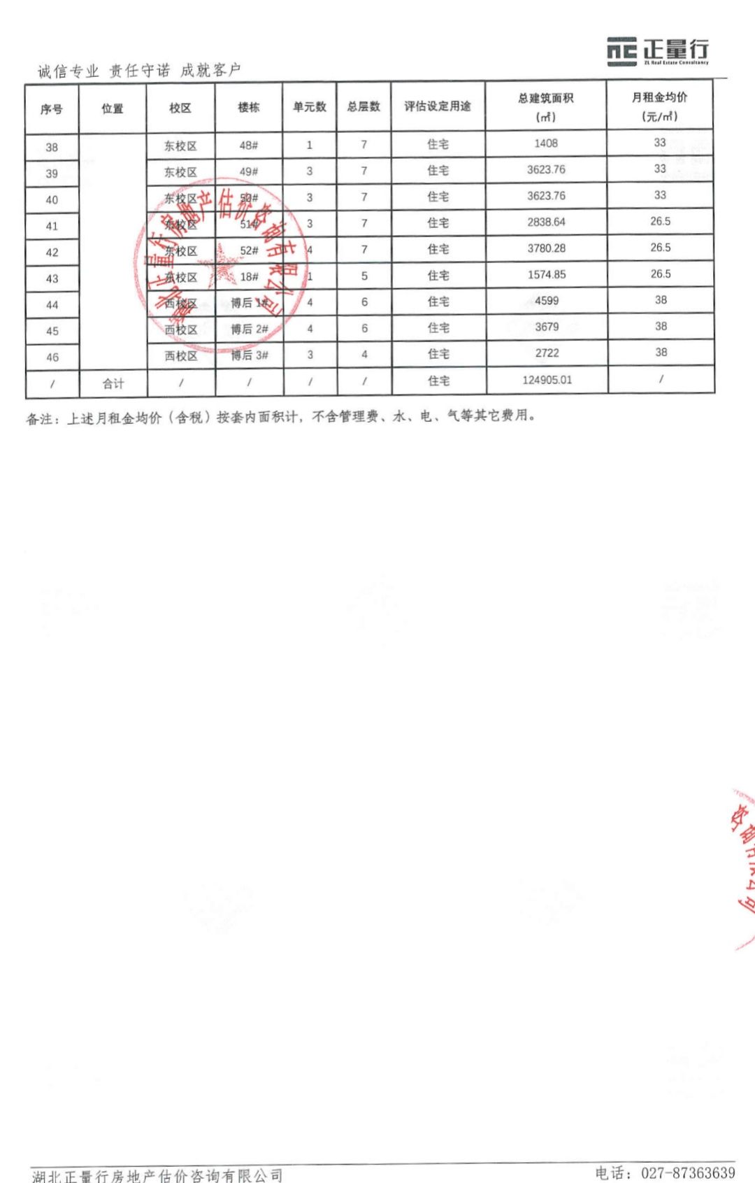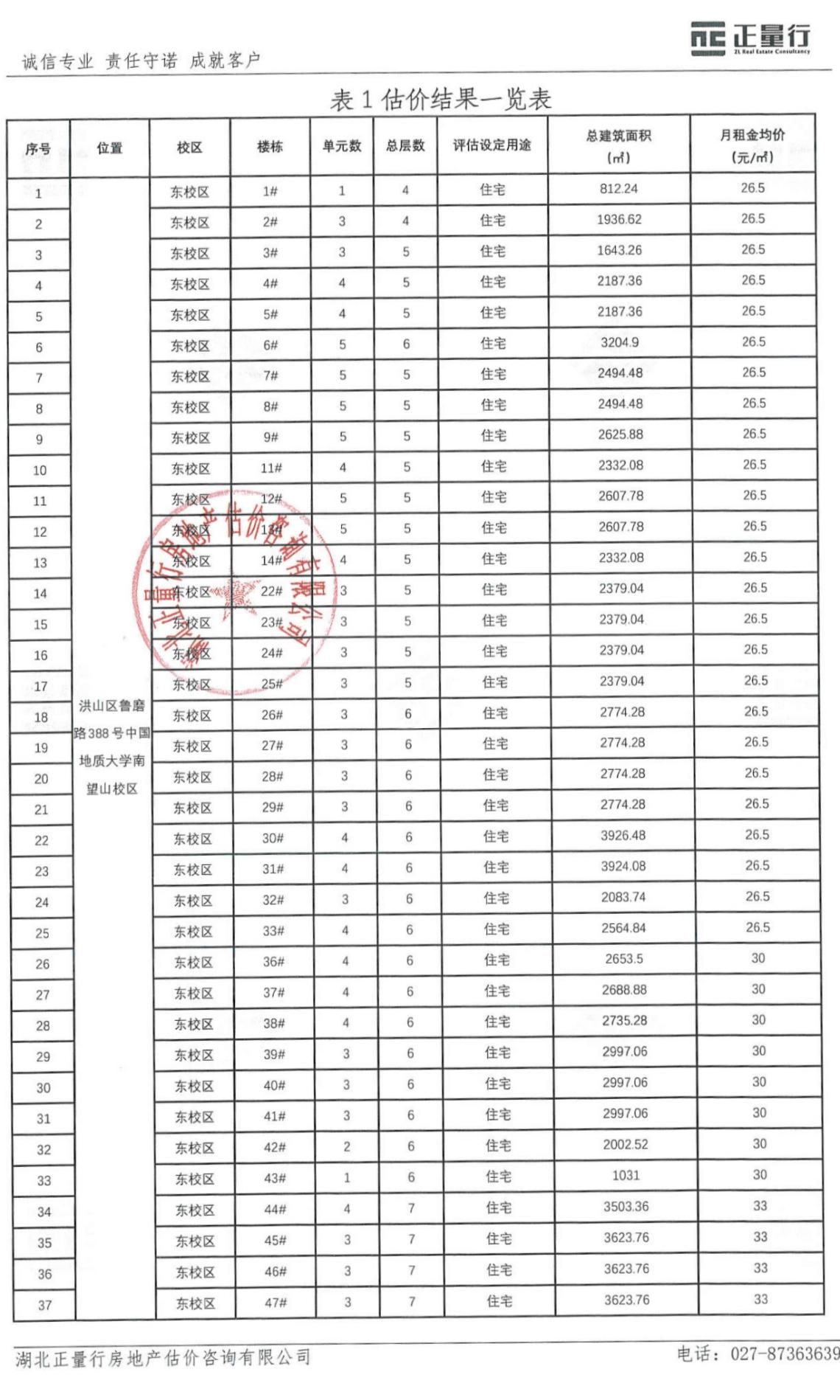 根据《bevictor伟德官网(武汉)周转房管理办法(修订)》(地大学校办发〔2023〕35号)规定,学校近期通过询价采购的方式确定,由第三方评估公司湖北正量行房地产估价咨询有限公司,对南望山校区46栋家属楼进行租金评估。评估结果已通过学校房产管理委员会审议,现将各楼栋周转房月租金均价公示如下。该标准自2024年1月1日起执行,执行期三年。