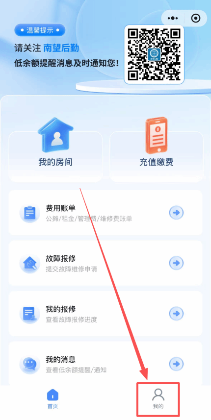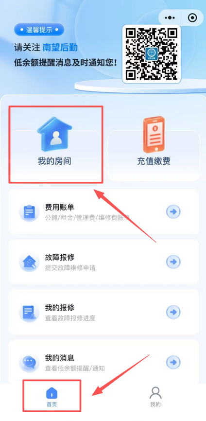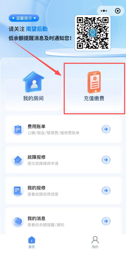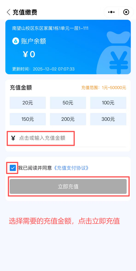 首页点击“充值缴费”进入或点击“我的房间”→“充值缴费”,点击或输入充值金额→完成充值操作。
