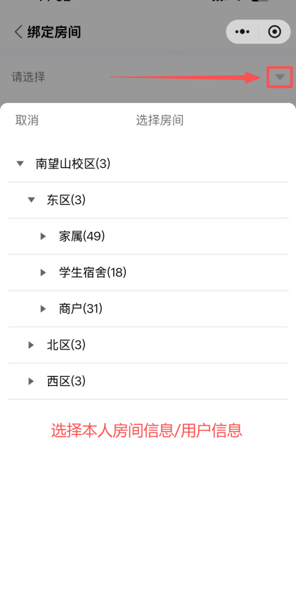 首页点击“我的房间”进入,下方“快速绑定房间”,选择本人房间信息/用户信息,确认绑定,输入姓名,确认入住。