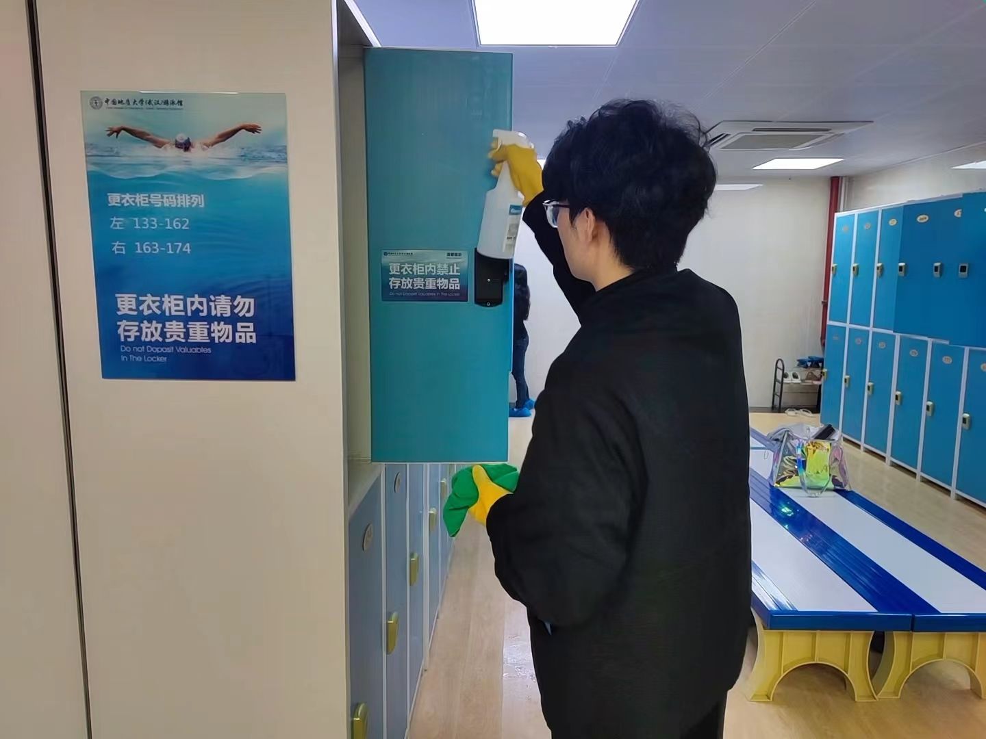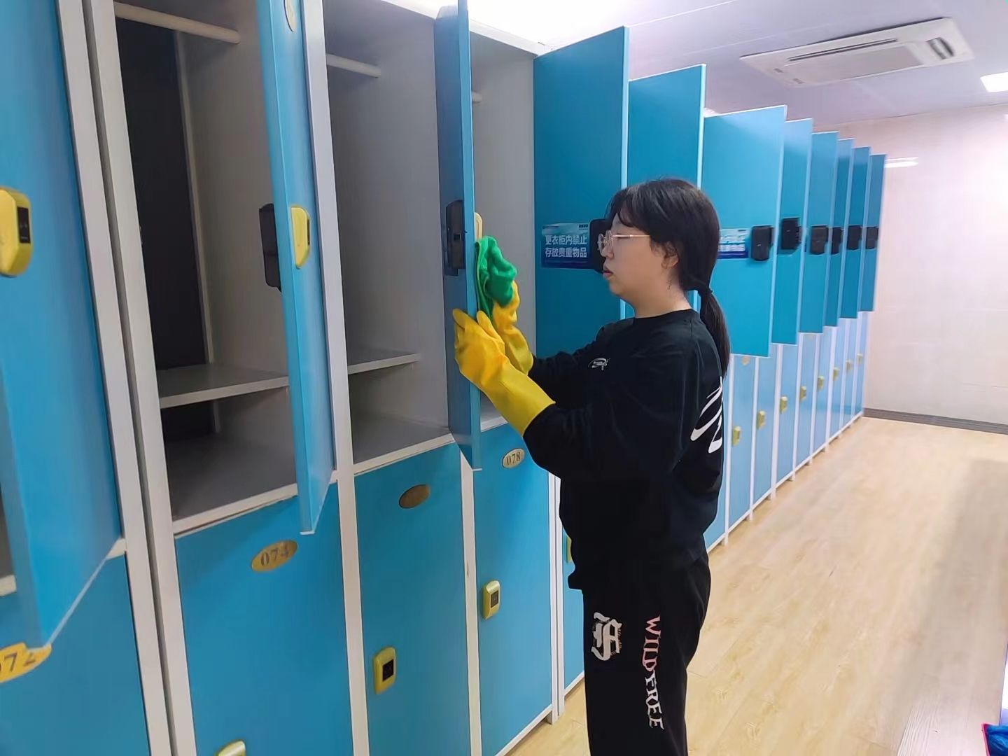 劳动实践前,游泳馆保洁员首先为同学们详细讲解了更衣柜清洁消毒的方法、标准及注意事项。在保洁员的指导下,同学们两人为一组,互相配合,积极投入到劳动中。先用湿布仔细擦拭更衣柜的表面,去除灰尘和污渍;接着用消毒液对柜体进行全面喷洒,杀灭细菌;最后,用干布将柜体擦干,确保柜内干燥通风。在劳动过程中,同学们不怕脏、不怕累,展现了出色的动手能力和良好的劳动态度,185个更衣柜被认真擦洗得干干净净。