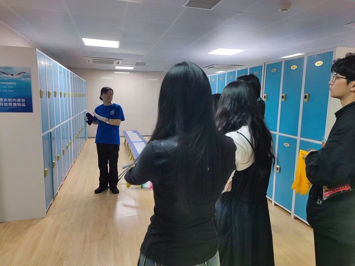 创新育人课程,丰富劳动育人形式。劳动月期间,以“存储柜清洗消毒”为内容的劳动教育实践课程在游泳馆持续开展,共计24名学生参加。