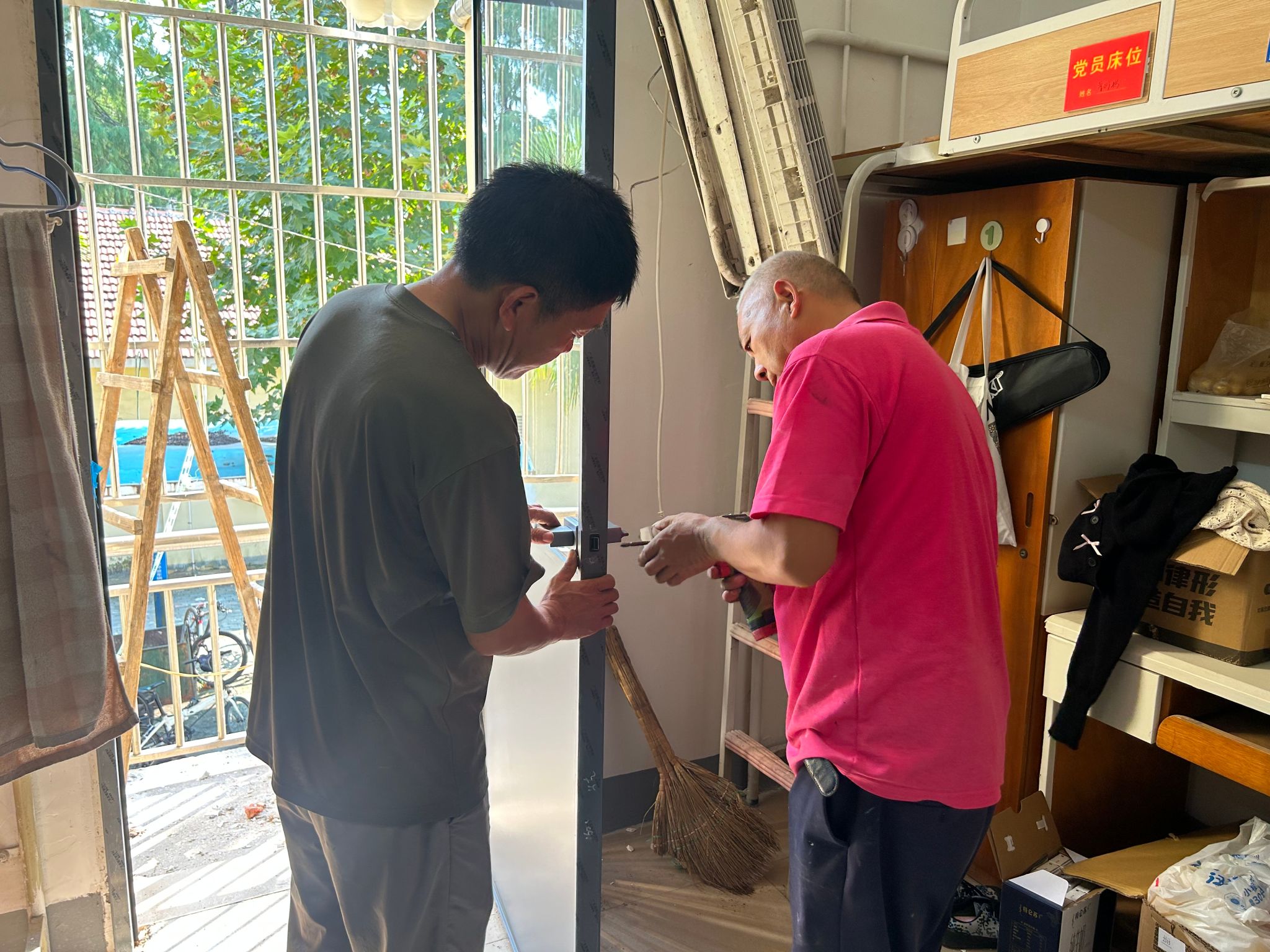 为确保工程顺利推进并最小化对学生的影响,中心的员工展现了高度的责任心与奉献精神。中心调派专人在施工现场进行每日巡查监督作业规范与安全措施,确保“拆一扇、安一扇、清一扇、粉刷一扇”,保持楼道畅通与环境卫生。工作人员提前发布施工通知,耐心解释工程进度,及时回应学生关切。面对施工时间与学生作息的冲突,工作人员反复优化作业流程,将噪声较大的作业严格安排在学生上课时段,全力保障学生休息环境。