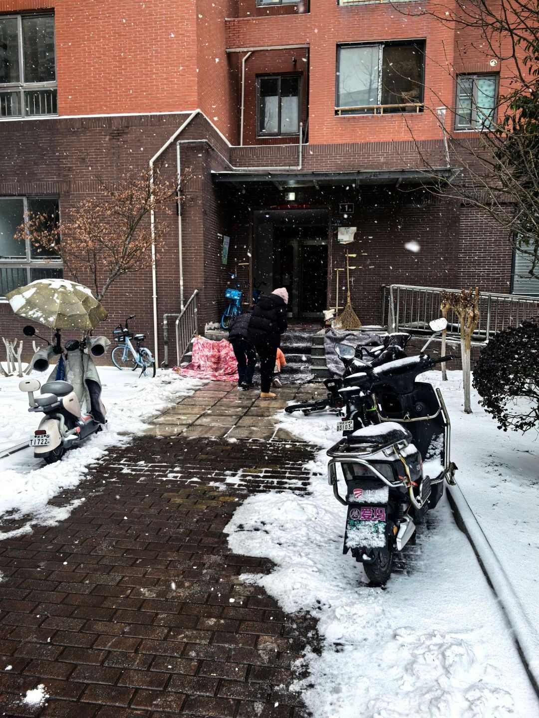 降雪不停,清雪不止。在全力开展暖心慰问的同时,社区工作人员率先到岗、主动担当,及时发出清雪倡议。辖区党员、小区物业人员及热心居民积极响应、迅速组建起一支“清雪突击队”。大家手持铁锹、雪铲、扫帚等工具,顶风冒雪奔赴辖区主干道、单元楼门口、坡道弯道等重点通行区域,有的弯腰挥铲破冰,有的奋力清扫积雪,有的默契配合清运雪堆,尽管寒风刺骨、双手冻红,但大家热情高涨、干劲十足,用忙碌的身影为居民开辟出一条条安全畅通的出行通道。