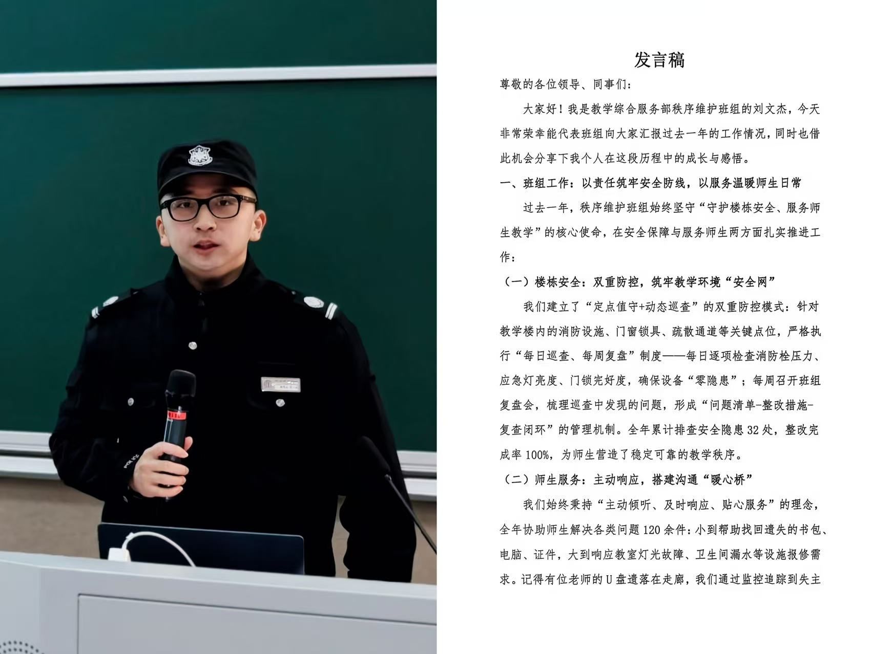 秩序维护班组代表的发言,生动诠释了“安全为先、服务为本”的初心。刘文杰坦言,最初上岗时,自己只把工作当作“站岗打卡、按规值守”的机械任务。真正的转变,源于一次日常立岗:见一位老师抱着厚厚一摞课件,费力推门却腾不出手,他下意识上前搭了一把。日常培训中那句“服务藏在细节里,秩序维护岗位不只是守岗,更是护人”,彻底点醒了他。从那以后,他开始主动跳出“被动执行”的局限,学会用细节传递温度——看到师生有重物、遇难题主动上前帮扶,巡查时不再只盯安全隐患,更留意师生需求,提前排查活动场地设施、随手清理角落杂物消除绊倒风险。这份从“要我做”到“我要做”的转变,让他真正读懂了秩序维护工作的价值,也完成了从“被动值守”到“主动服务”的成长跨越。周祖胜以“勤、责、爱”三字概括履职心得,本质上是主动服务理念的生动延伸:“勤”是贴合师生作息规律,精准衔接值守时段;“责”是主动排查安全隐患,筑牢校园安全防线;“爱”是主动关注师生需求,以细节关怀传递服务温度。