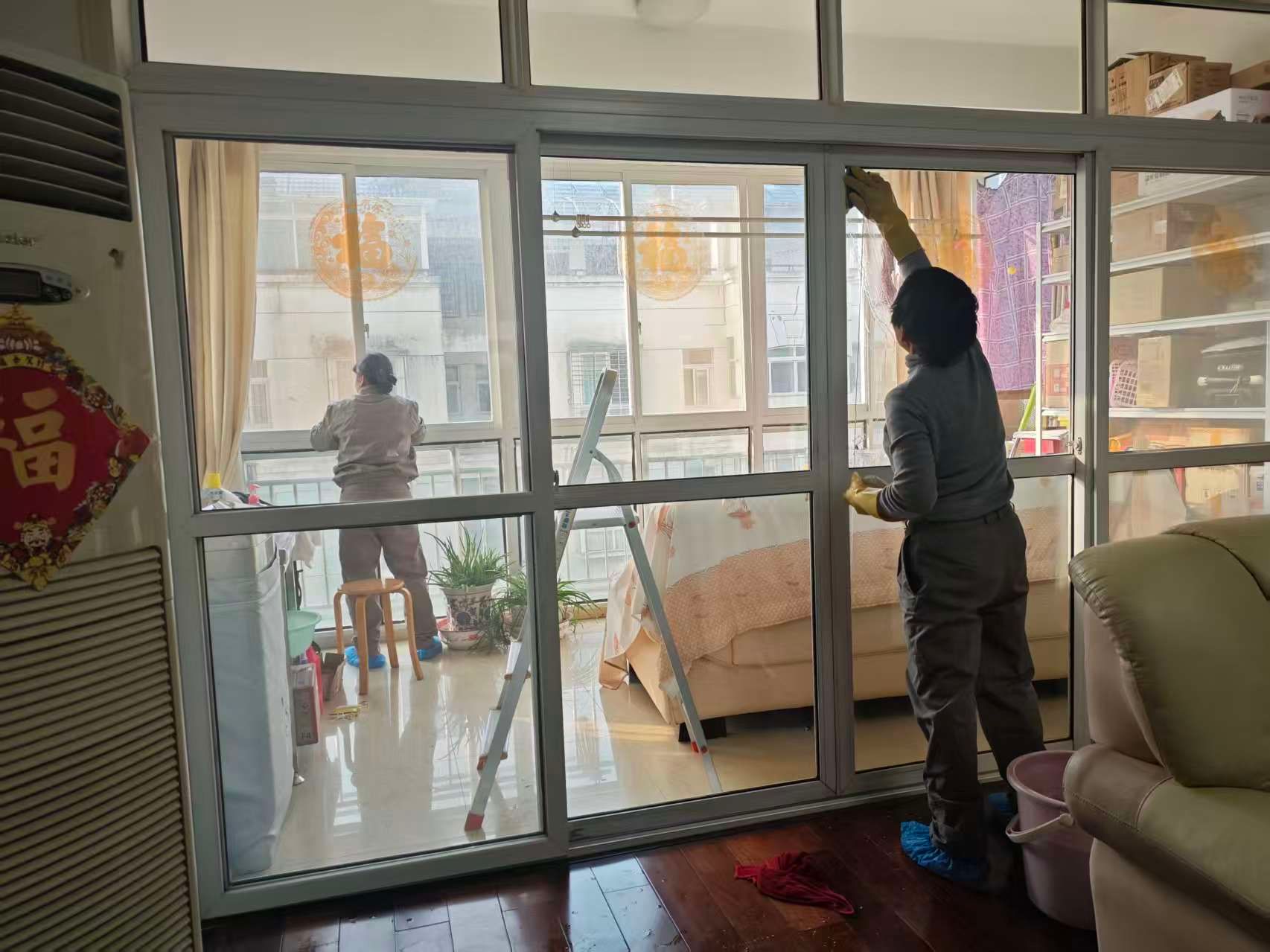 服务现场,工作人员分工协作、默契配合,没有丝毫懈怠,始终秉持“细致、周到、贴心”的原则,用双手传递温暖,用实干诠释担当。客厅里,他们弯腰擦拭地面、认真打理家具,不放过任何一个角落的灰尘;卧室中,他们细心擦拭门窗、整齐摆放物品,用细致守护老教师的舒心起居;厨房里,他们耐心清理油污、擦拭灶台橱柜,还原整洁清爽的烹饪环境;卫生间、阳台上,他们认真清扫、规范整理,每一个动作都饱含温情。作业过程中,工作人员严格恪守服务规范,时刻尊重老教师的生活习惯,未经允许绝不随意挪动贵重物品,高层窗户清洁时,全程采用长杆工具作业,并安排专人全程监护,全力确保操作安全。