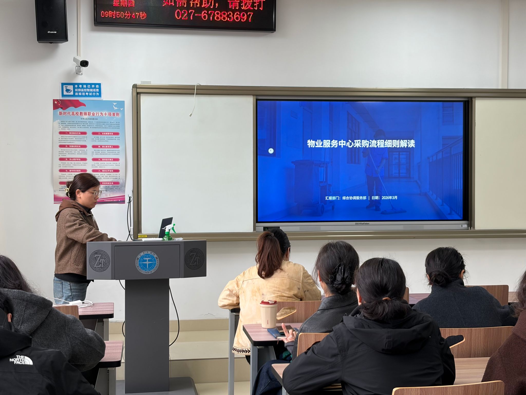 为进一步规范采购管理流程,提升校园维修服务效能,3月19日,物业服务中心组织开展采购流程细则与维修工作专题讨论会。讨论会由中心党支部书记江琼主持,综合协调服务部相关负责同志担任主讲。