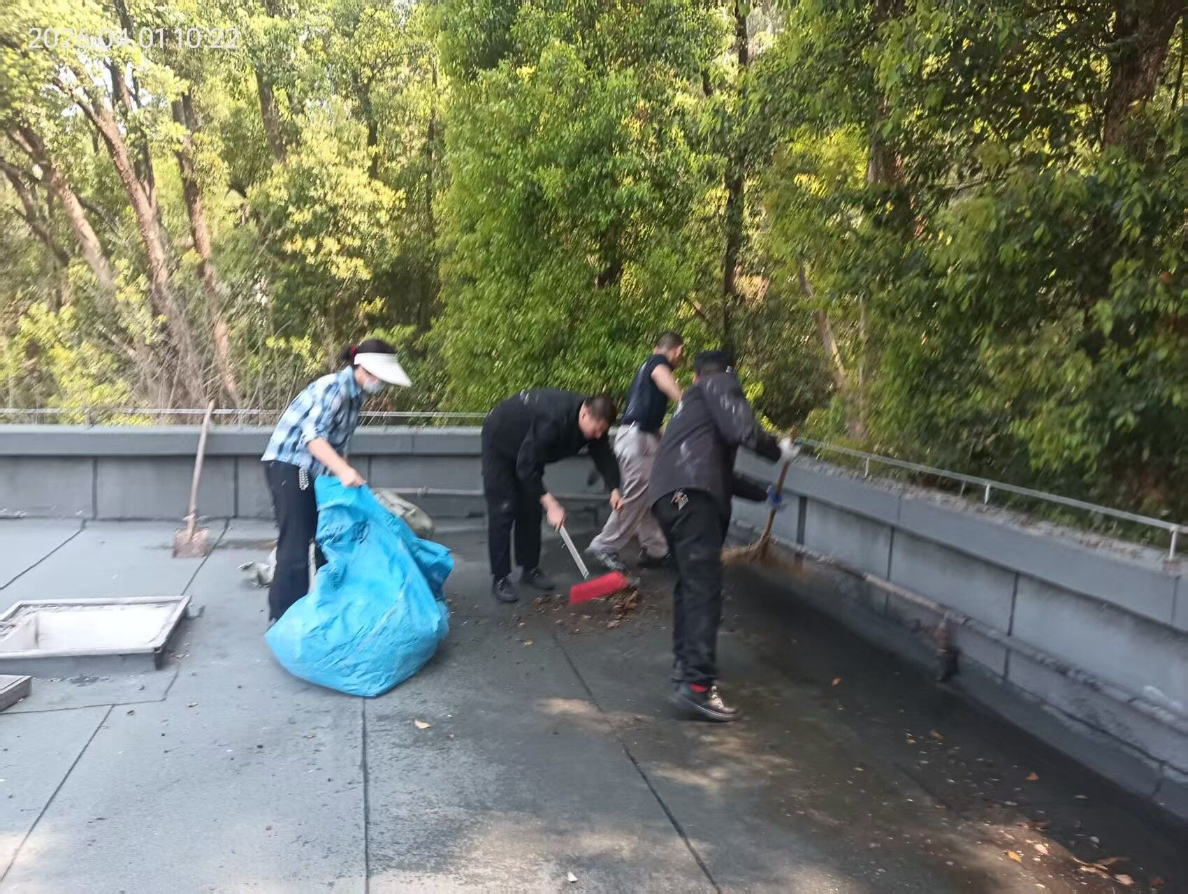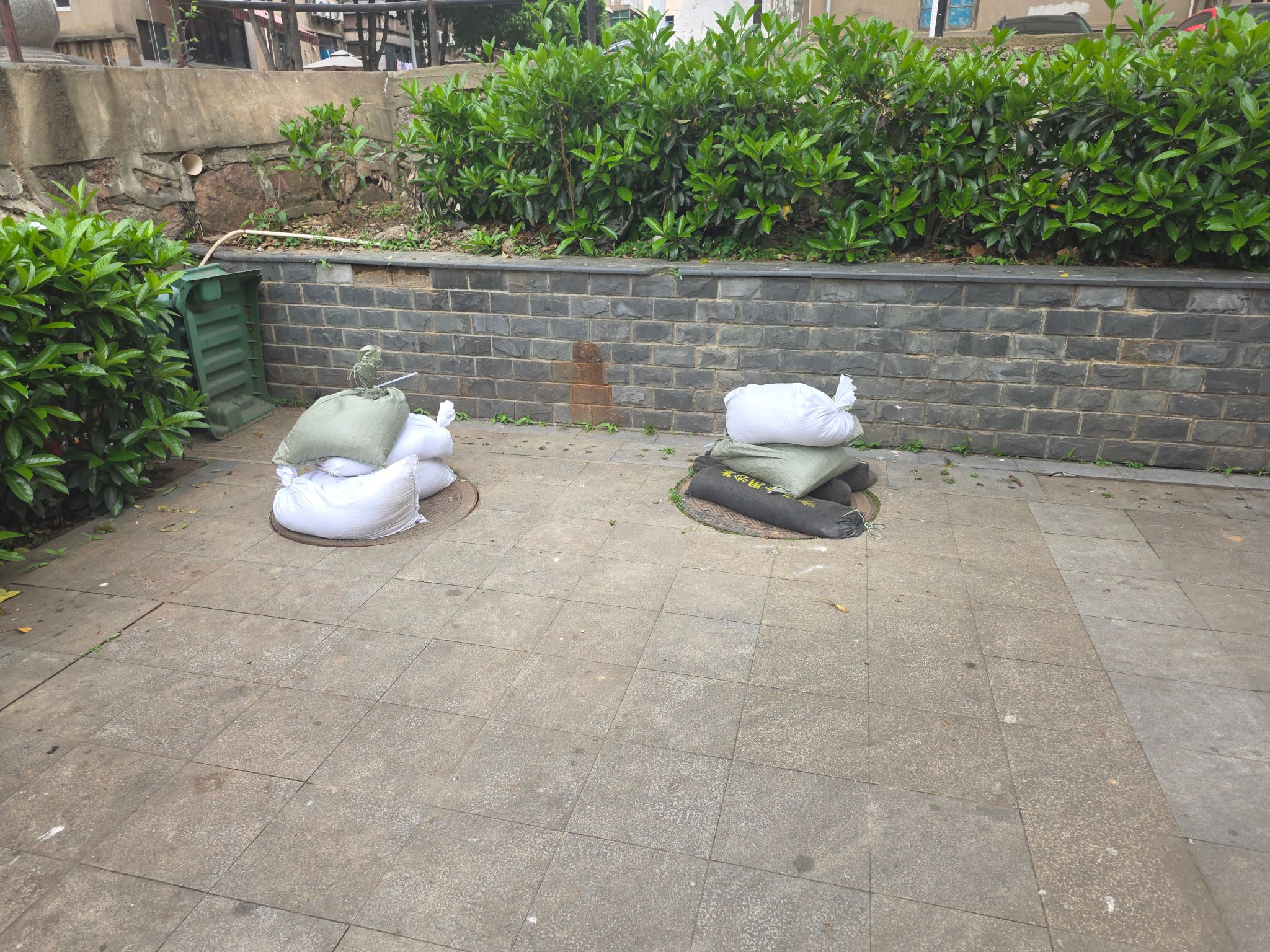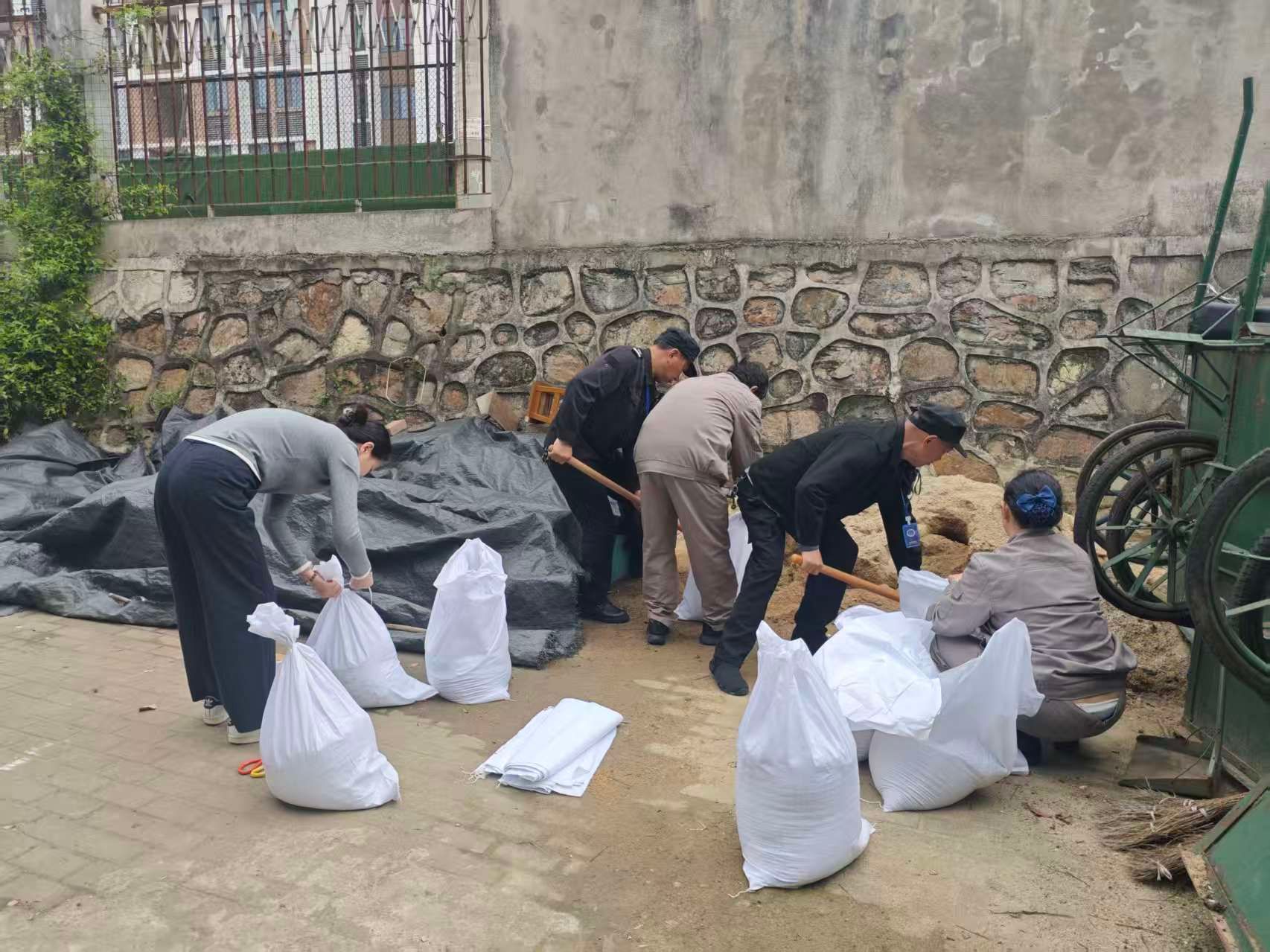 未雨绸缪,精准部署,筑牢防汛前置防线。汛情来临前,中心密切关注气象预警信息,第一时间召开防汛工作部署会,明确各岗位职责,细化应急处置流程。同时,主动向校园各保障单位送达防汛告知书,明确防汛责任,凝聚合力。启用无人机对所辖楼顶开展全方位巡查,排查楼顶排水口堵塞、积水隐患并组织人员进行全面清淤;细致清理公共区域明沟内的杂物、落叶和淤积泥沙,确保排水通道畅通;对东区幼儿园、柳池周边等积水区域的井盖逐一加装沙袋压实,防范暴雨冲击导致井盖移位、雨水倒灌,从源头降低防汛风险。对电梯机房、井道及底坑展开全覆盖隐患排查,重点核查渗漏、积水等风险点,确保防风、防雨、防渍水措施落实到位。同时,物业提前备足沙袋等防汛物资170余件,通知应急小分队成员处于待命状态,为高效应对持续暴雨天气做好充分准备。