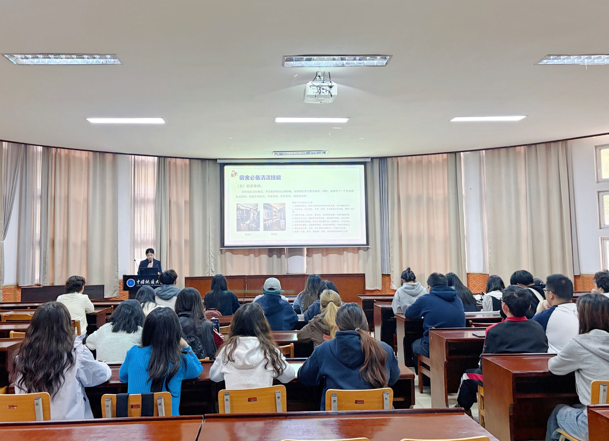 为切实解决学生宿舍内务难题,提升学生生活自理能力,营造整洁、文明的宿舍环境,4月16日下午,学生住宿服务中心在东苑会议室及学生宿舍开展了一场别开生面的宿舍清洁学习实践活动,共有25名学生参与。