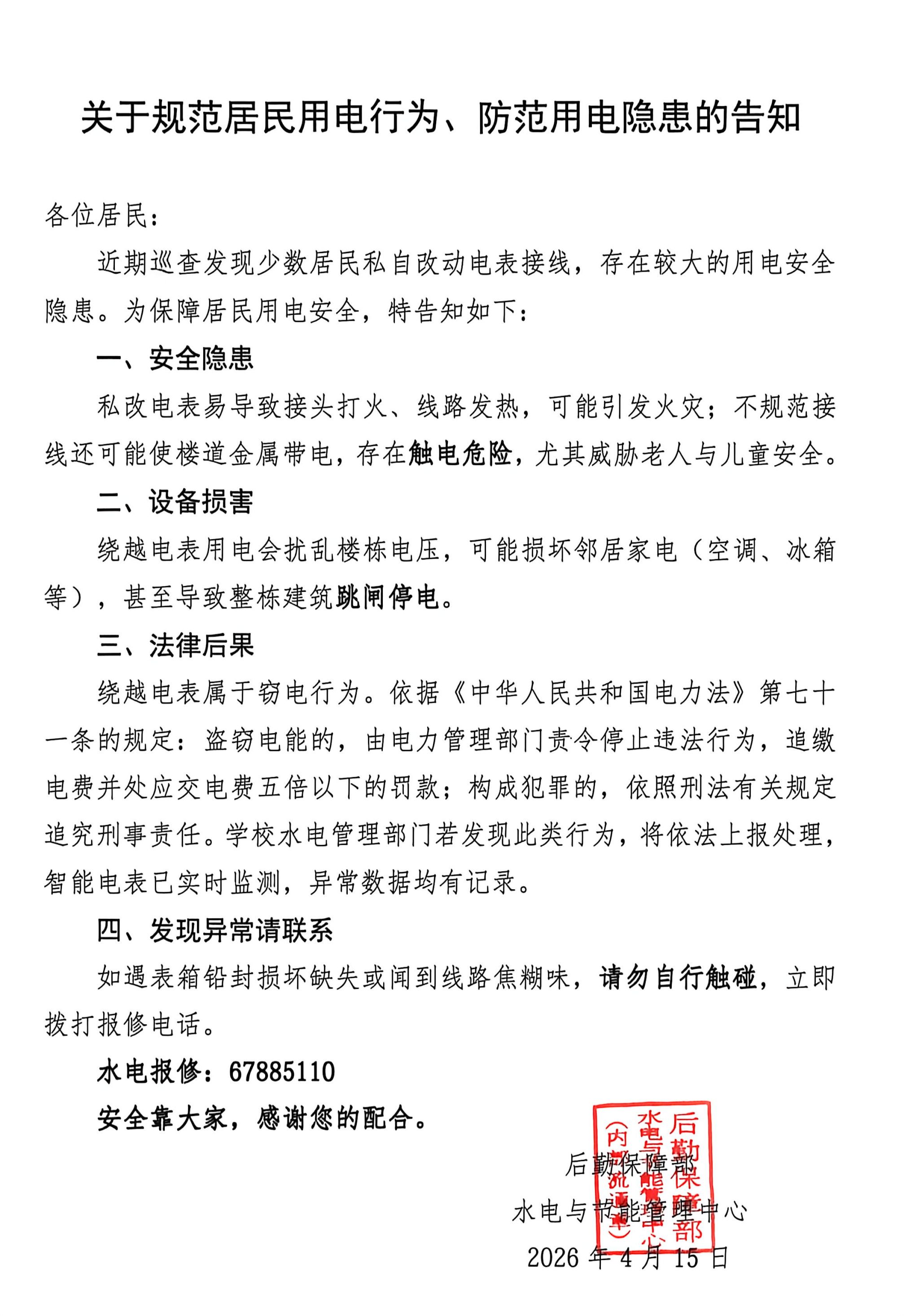 活动中,工作人员在各单元楼栋出入口、公告栏统一张贴告知书,并向居民讲解私改电表、绕越用电的安全隐患与法律后果。告知书明确提示,私改电表易引发火灾、触电,损坏邻居电器;绕越电表属于窃电行为,依据《中华人民共和国电力法》,将面临追缴电费、罚款乃至追究刑事责任。