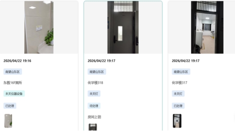 “卫生间角落的排风扇是否人走断电?”“楼梯间管道井有无滴水痕迹?”活动中,师生严格对照巡查标准,不放过任何一处死角。各小组穿梭于教室、走廊、设备间,重点检查水电设施运行状态、违规用电情况及水资源浪费现象。对于能现场整改的问题,党员带领学生即时处置;暂时无法修复的,则通过专用巡查二维码详细登记地址、问题描述与现场照片,由责任部门跟进闭环处理。