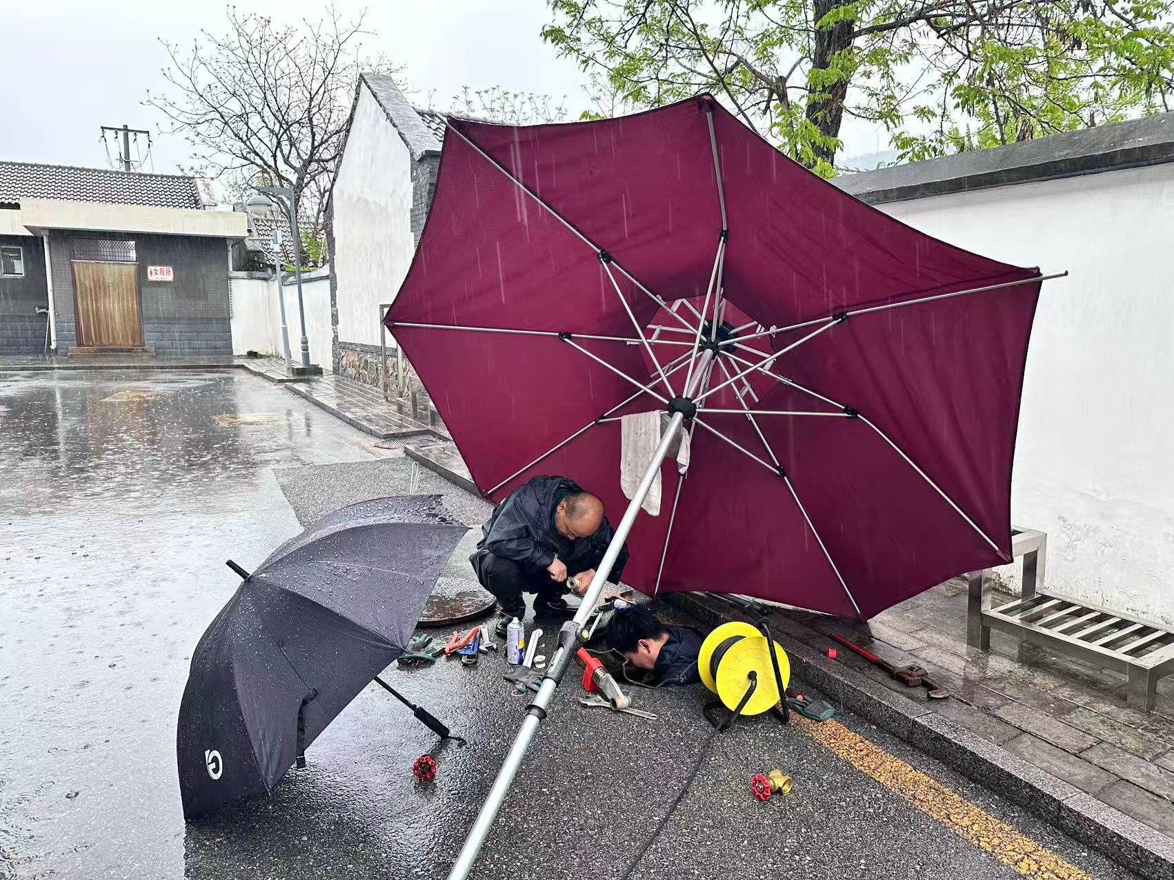 为确保首次接待任务平稳落地,中心领导班子高度重视,提前统筹调配人员力量,专门从秭归基地借调骨干工作人员支援,对宿舍、食堂操作间、公共活动等区域全面清洁。师生到站第一天,北京遭遇暴雨天气,主供水管线出现破裂,中心副主任朱响林第一时间赶赴现场,带领维修工毕发志冒雨开展抢修工作,面对泥泞的作业环境和湿冷的天气,两人连续作业4个多小时,最终成功恢复供水,用实际行动践行了“服务不打烊、保障无死角”的工作承诺。