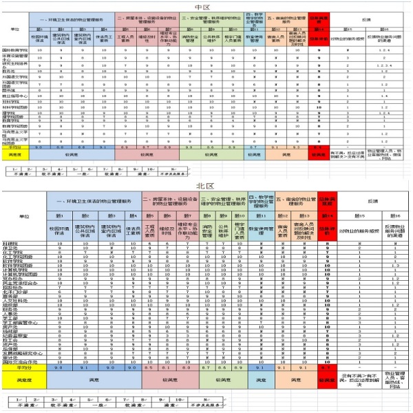 1.北区、中区物业服务总体满意度为“较满意”,其中,北区“房屋本体、设施设备的物业管理服务”、“安全管理、秩序维护的物业管理服务”得分偏低,待加强提升;中区“教学楼宇的物业管理服务”得分偏低,待加强提升。