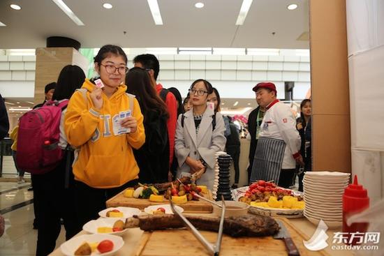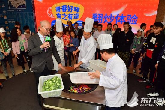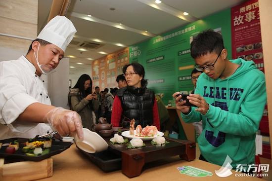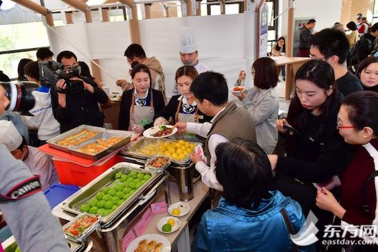 东方网通讯员焦苇、记者刘轶琳11月11日报道:海鲜墨鱼饭、菊花鱼、玉兔豆腐……今天中午,第一届上海大学生美食节在复旦大学江湾校区举办,15所高校的45道人气美食集中交流展示。现场“经典菜”、“网红菜”、“创新菜”盘盘精彩,既美味又营养,令人馋涎欲滴。
