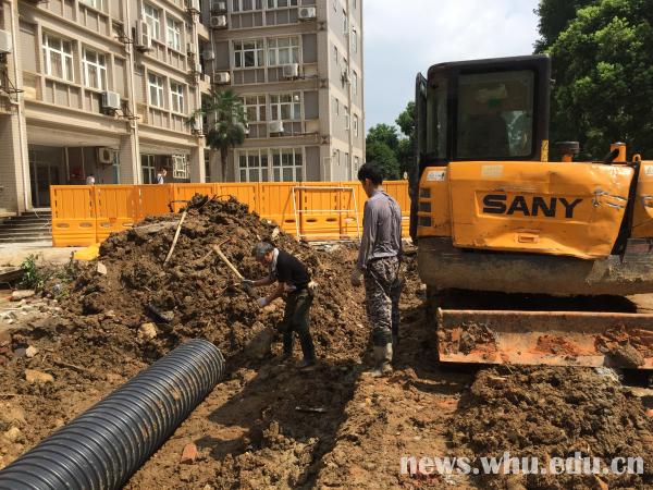 在生命科学学院消防水池管道改造工程中,修缮中心的工人们在室外工地上挥汗如雨,有时甚至因为施工需要需将双脚泡在炙热的泥水中。他们日夜赶工,全然顾不上烈日的炙烤和蚊虫的叮咬。