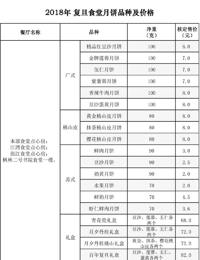 复旦大学的月饼种类有广式的、苏式的和桃山皮的。口味繁多,并且既可单个零售,也有礼盒装售卖。