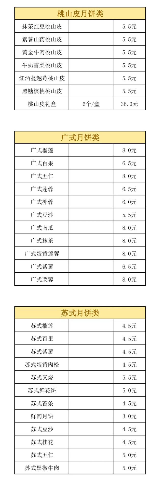 月饼品种(苏氏):蛋黄莲蓉月饼,3元/个、五仁月饼,3元/个、绿豆沙月饼,2元/个、鲜肉月饼,3元/个。