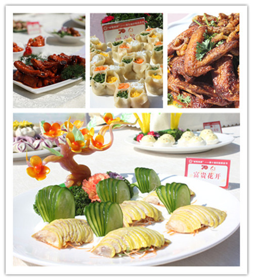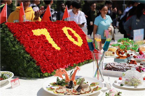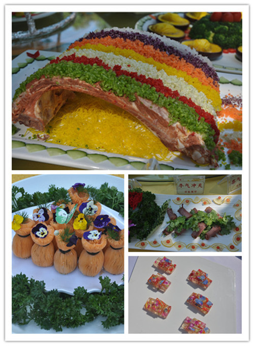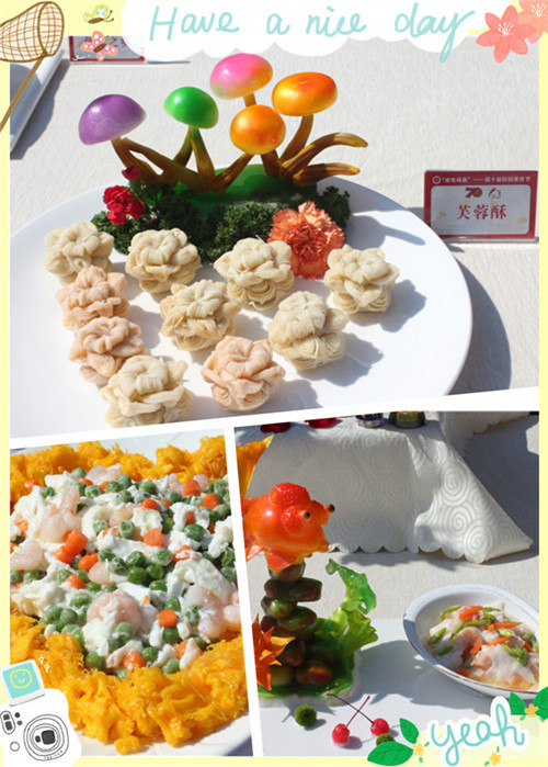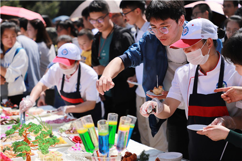 为了响应“迎校庆,迎国庆,献祝福”的主题,各个餐厅都使出了浑身解数。主展台上,“四川省五一劳动奖章”获得者刘家升雕刻的龙栩栩如生,孔雀、白鹤振翅欲飞,“庆祝中华人民共和国成立70周年”的哈密瓜雕刻字样表达着后勤人的热烈庆贺。其他美食展台上也毫不示弱,或小国旗加持,或花瓣添彩,或蛋糕助力……就连菜名都巧花心思,“翠竹报春”、“一帆风顺”、 “游龙穿翅”、“牛气冲天”、“欢天喜地”, 驻足观赏的师生们纷纷掏出手机,用图片记录下一道道色香味美、创意十足、造型精美的菜品,分享到朋友圈中,让朋友们也分享这份喜悦。