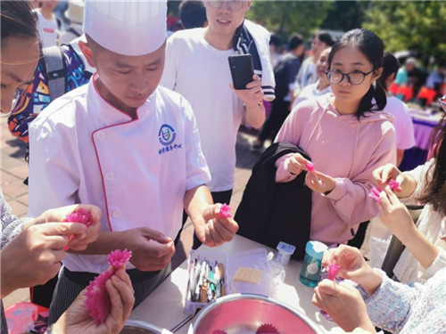 活动现场还设置了现场教学环节,金牌厨师现场手把手教学,从配料到主材,从掂锅到翻炒,每一个细节的知识点都同步讲解、实时演练,保证同学们做出一盘香喷喷的完美菜肴!除了贴近生活的炒菜教学,烘焙裱花、果蔬雕刻的教学也吸引了无数眼球。光电科学与工程学院2019级新生陶朝靖在“小炒哥”王义贤的帮助下,完成了第一道菜的制作。他说:“我真的太佩服师傅了,那么重的锅在他那儿是颠勺,在我这是砸锅!”一次简单的川菜教学,让新生感受到了食堂厨师们的不易,敬佩心油然而起。