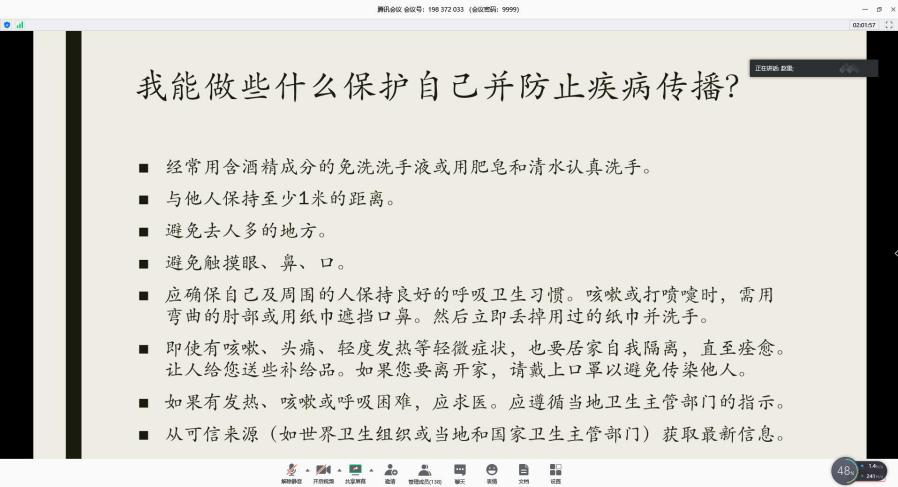最后,后勤保障处林芸副处长对培训做了总结,对两位专家的精彩讲授表达了感谢,要求大家按照培训内容注意科学消杀,做好个人防护,并播放了如何正确使用防护用具的科普视频。通过此次课程,大家对如何加强日常消杀和个人防护有了更清晰的认知,帮助大家强化了防范意识、增强了防范的科学性,进一步维护了校内师生群众的身体健康,更有针对性的帮助我们保障好疫情防控和复工复学各项工作。