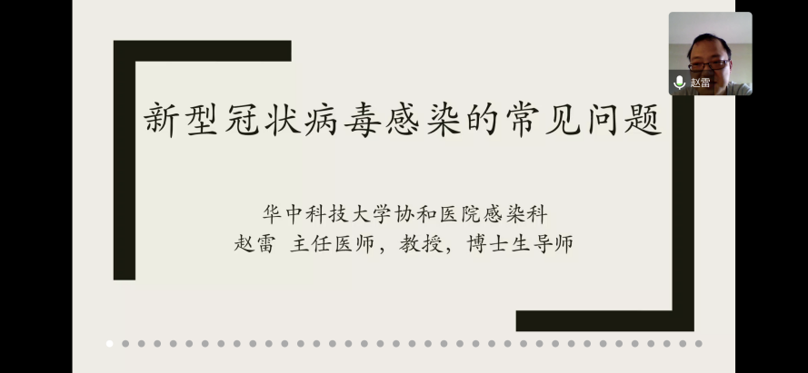 随后,来自华中科技大学协和医院感染科的主任医师、教授、博士生导师赵雷给大家带来了题为《新型冠状病毒感染的常见问题》的培训。赵教授的培训专业性较强,他系统全面的向大家介绍了冠状病毒和2019冠状病毒病的界定、症状、传播途径以及个人如何防止疾病传播等基本概念知识。随后,赵教授由浅入深,对新冠病毒的临床表现及分型、病原学及血清学检查、鉴别诊断及治疗、出院标准和注意事项向大家做了介绍。