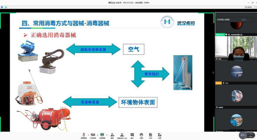 武汉市疾病预防控制中心的许慧琼老师题为《新冠肺炎学校清洁消毒及健康防护》的培训从消杀法规和传染病消毒基本概念入手,讲解了针对不同环境应该如何选择消杀方法,强调校园空间应该从预防和终末两个方面去加强日常消毒工作,并对消毒的要点要求、关键点的具体消毒做法、常见的消毒器械和消毒方式相关知识做了讲解。最后,许老师针对大学校园环境阐述了健康防护的要点和消毒剂的配置及注意事项。
