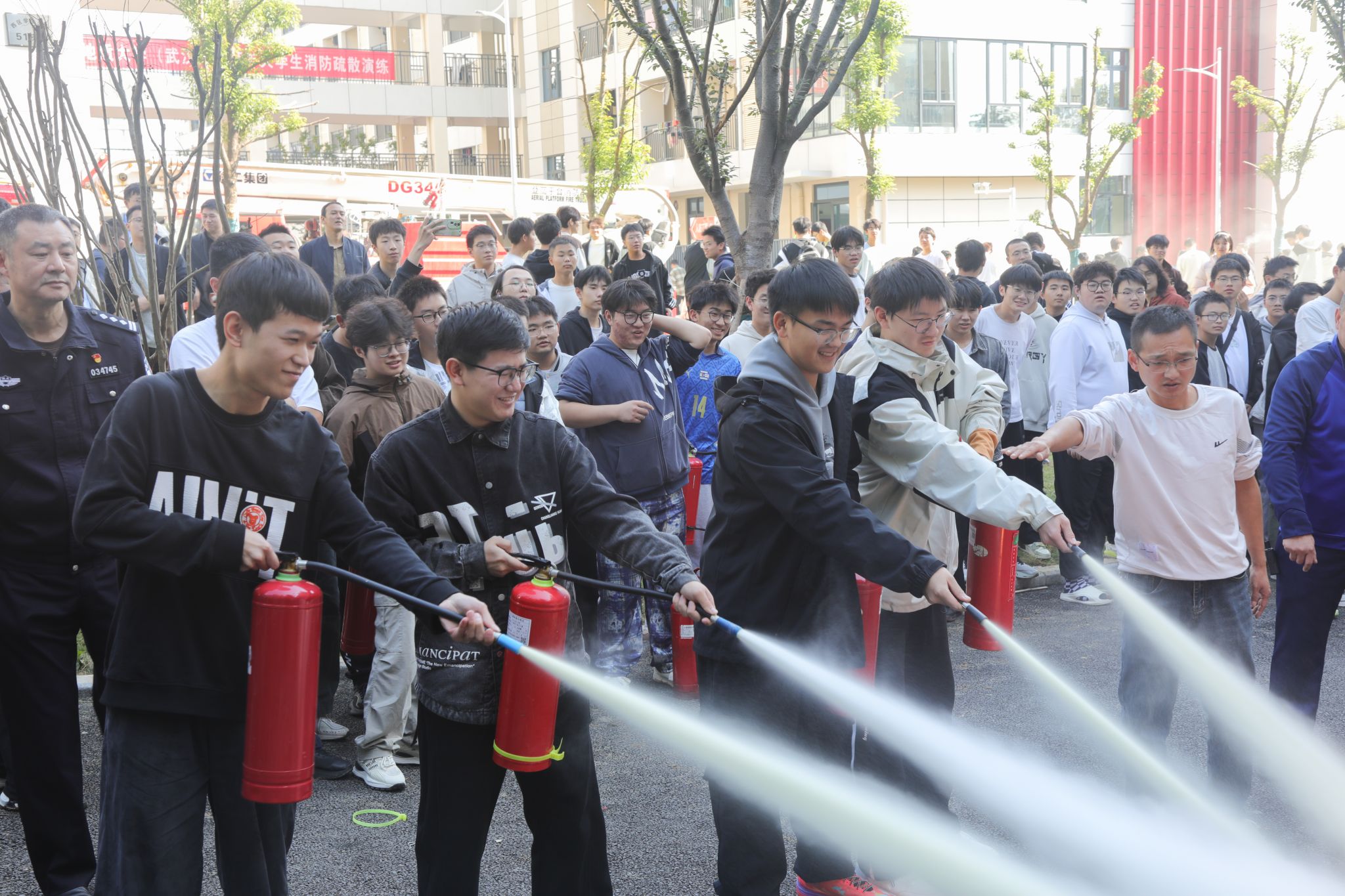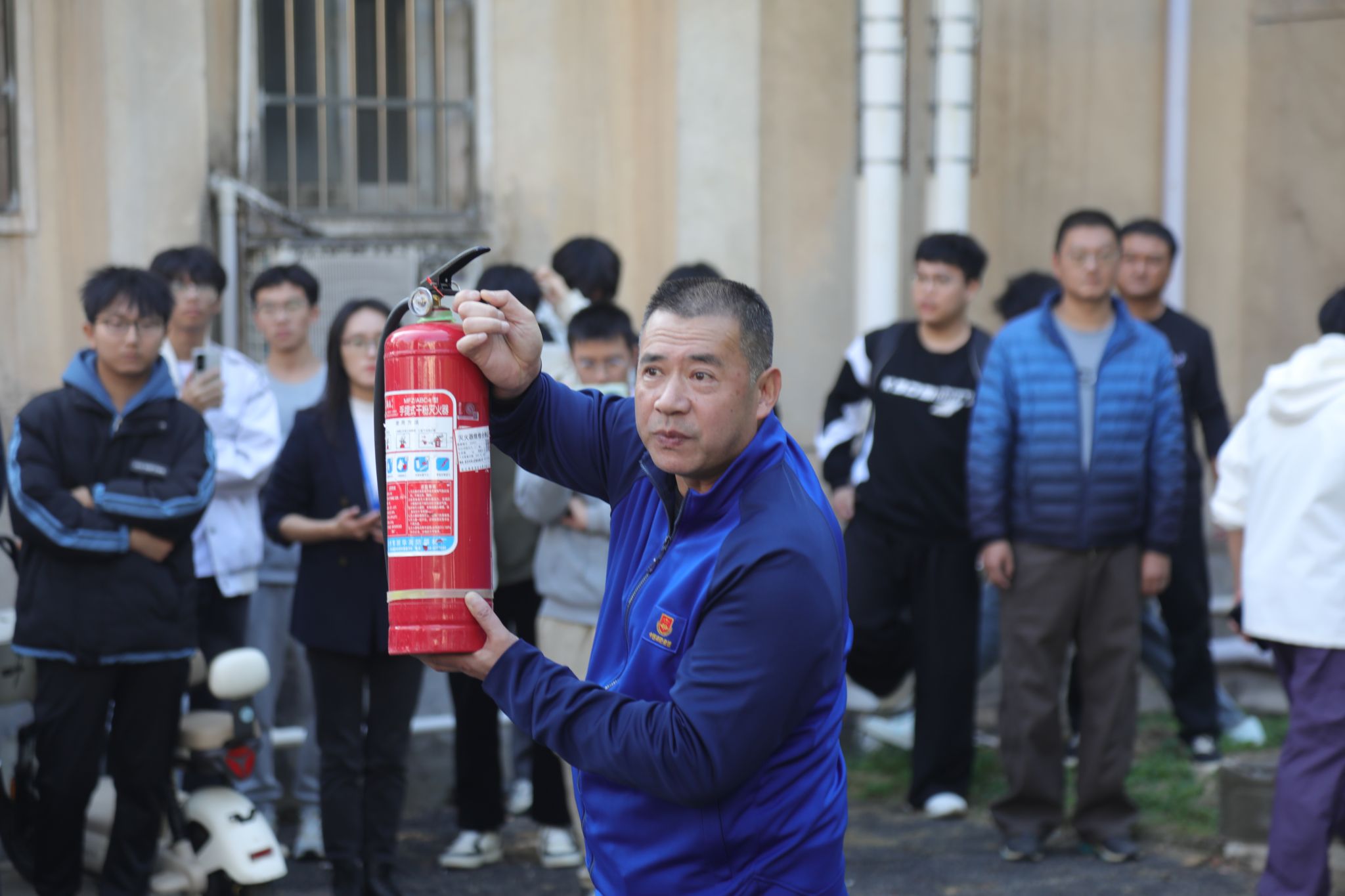 在实操环节,安全保卫部消防科科长刘从贵结合演练情况,向师生详细讲解灭火器使用方法,重点演示“提、拔、握、压”操作步骤。师生们踊跃上场实操,亲身体验灭火过程,切实掌握了基本灭火技能。