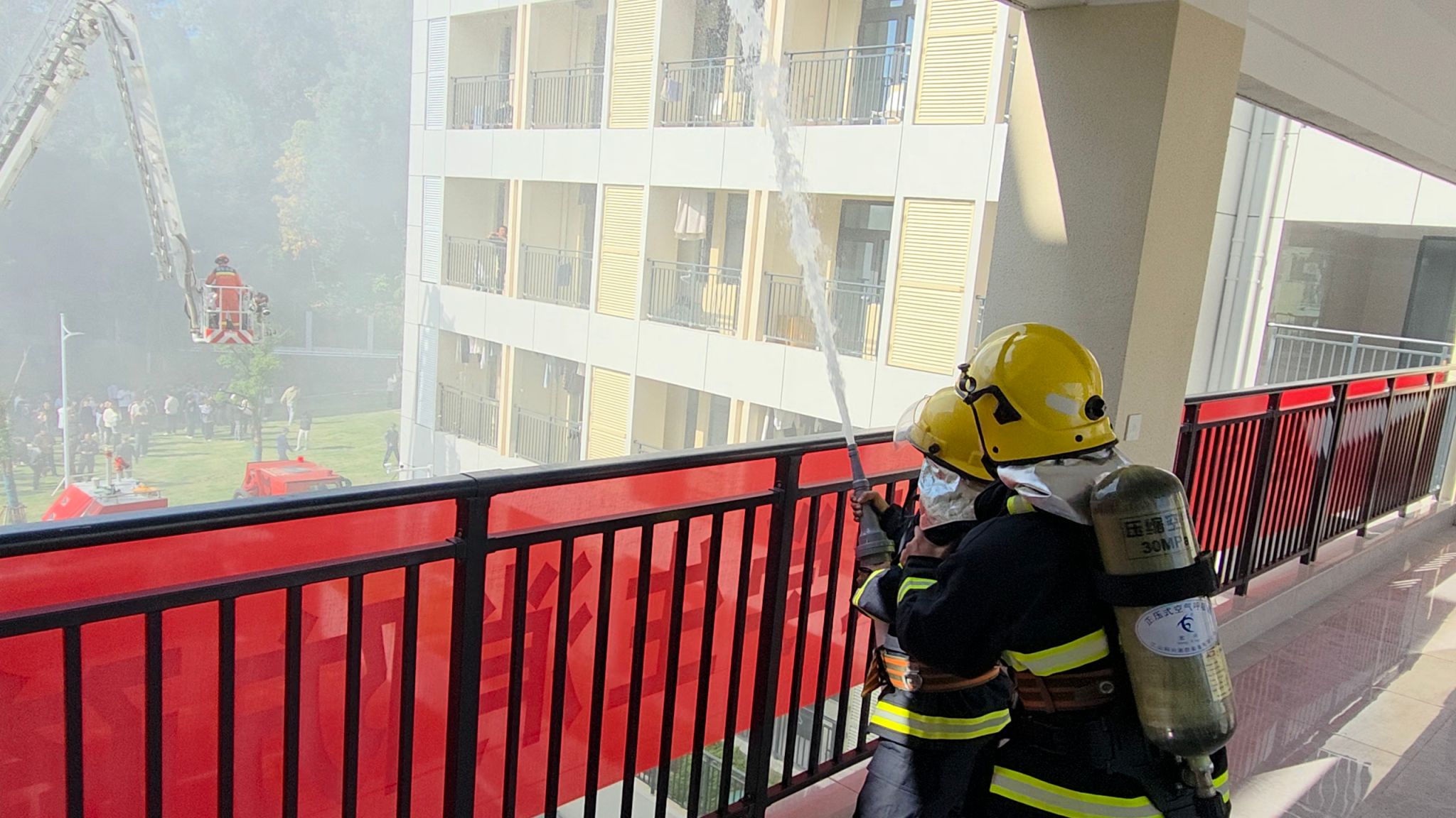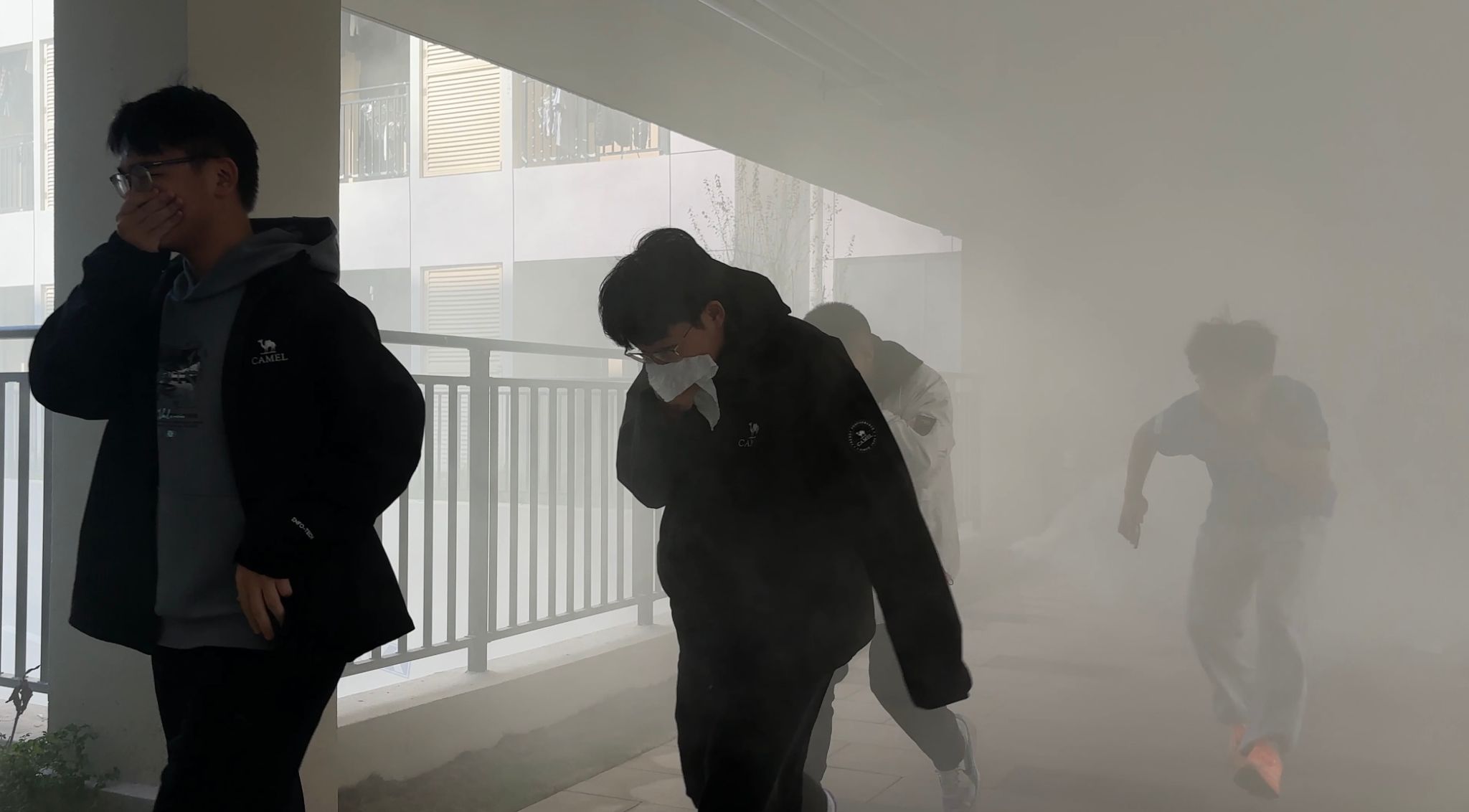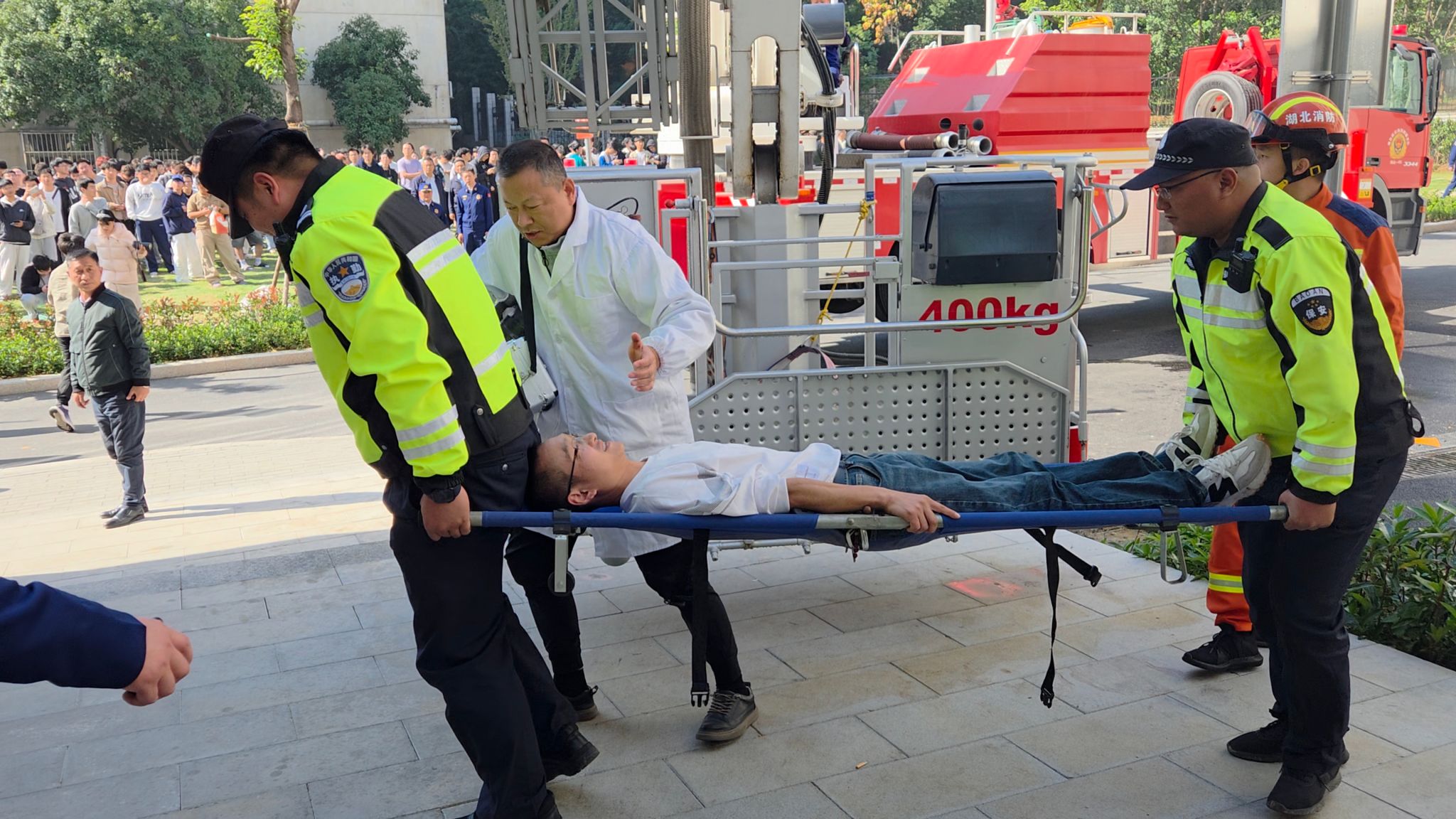 11月13日13时,随着烟雾弹点燃,演练正式开始。模拟火情发生后,宿舍管理员迅速上报并启动应急预案,组织学生有序疏散。按照“安全第一、就近逃生”原则,工作人员引导学生捂住口鼻、弯腰低姿,沿预定路线快速有序撤离。针对部分学生紧张慌乱、疏散速度较慢的情况,引导人员及时安抚情绪、纠正逃生姿势,保障疏散过程安全高效。短短五分钟内,全体参与人员均顺利撤离至安全区域。与此同时,消防队员迅速展开灭火行动,并使用云梯对“被困人员”实施救援,担架转运组将“伤员”转移至医疗救护点,整个过程紧张有序、协同高效。