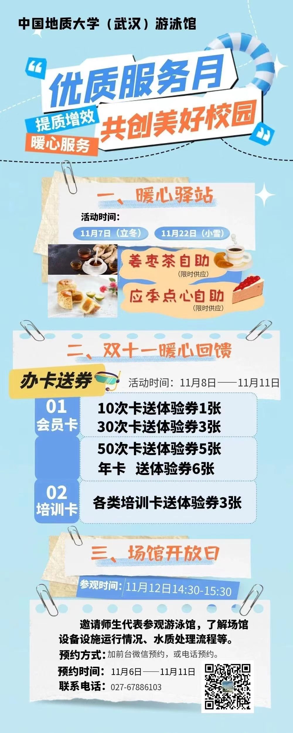 时值立冬,物业服务中心优质服务月系列活动迎来重要一环——地大游泳馆“暖冬”主题服务正式拉开帷幕。本次活动秉持“温馨服务,暖意相伴”的宗旨,致力于在寒冷的季节里,为顾客打造温暖如春的健身体验,传递无微不至的人文关怀。