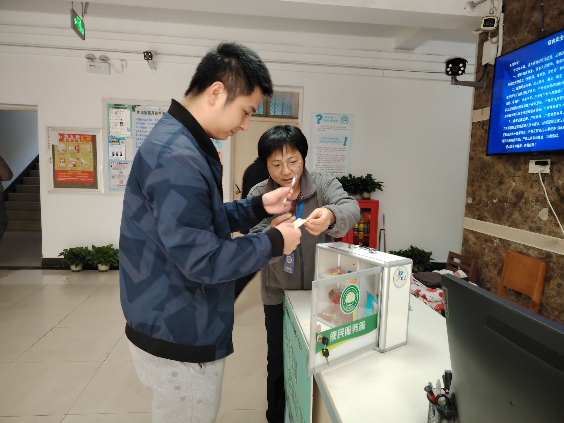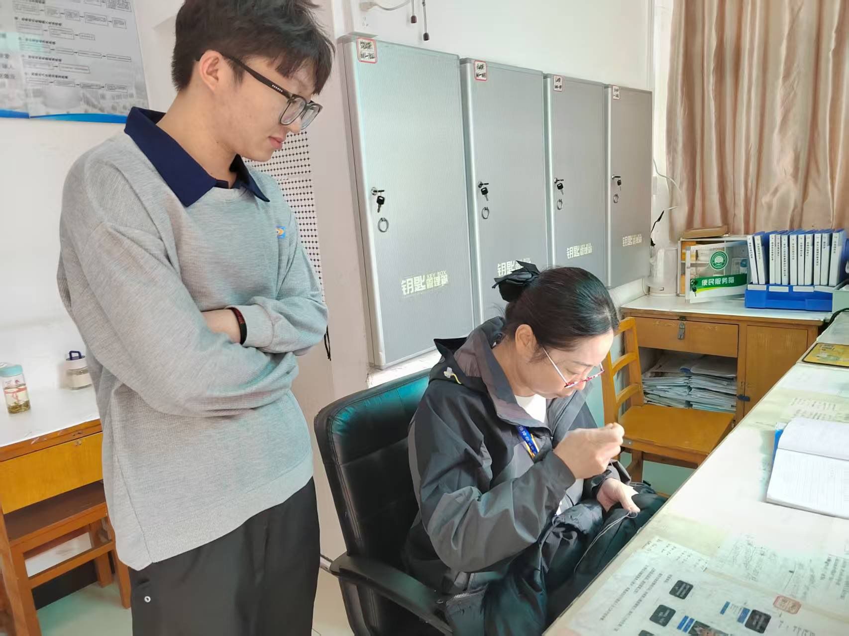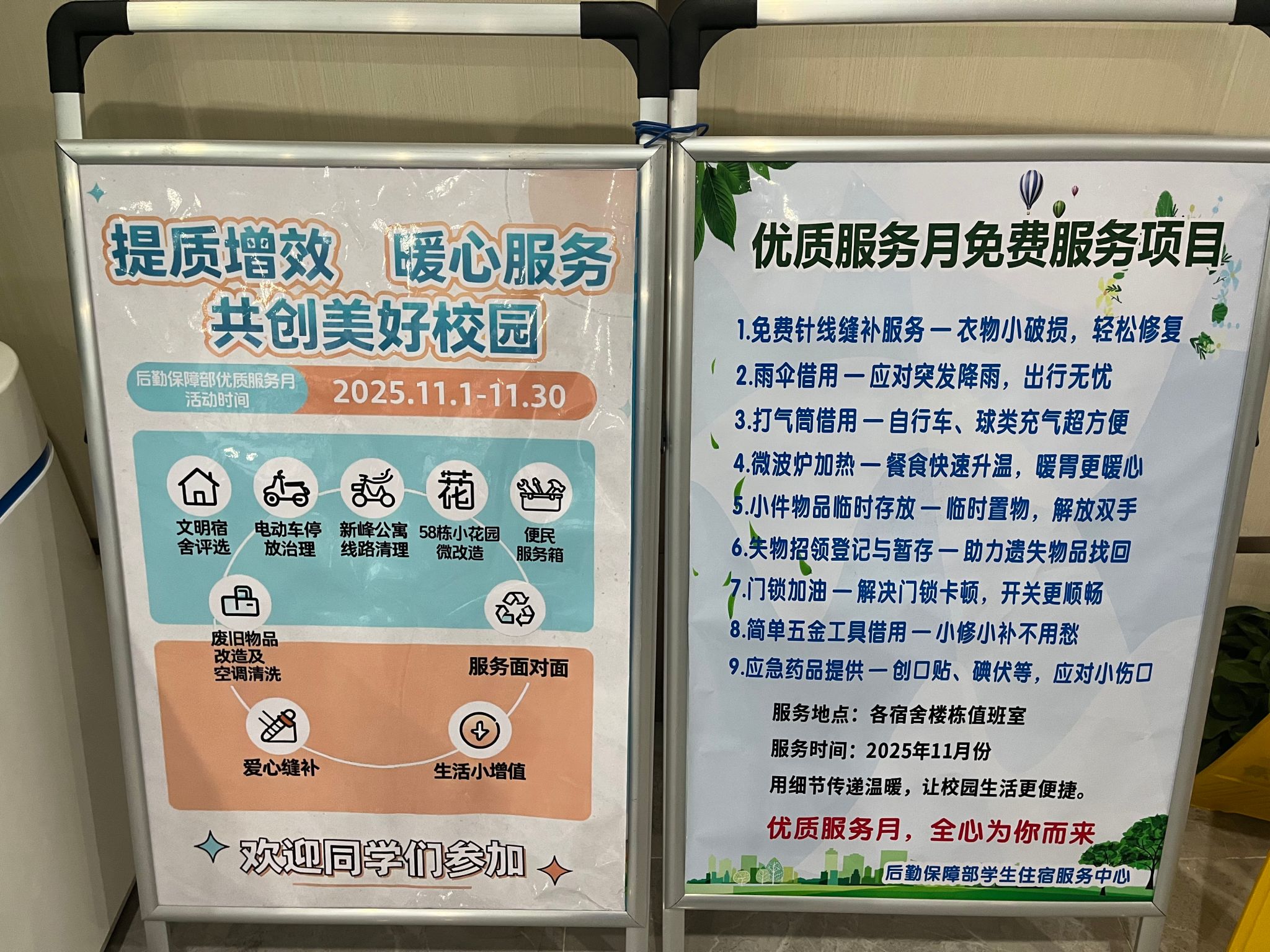 活动期间,中心精准对接学生“急难愁盼”,推出系列免费便民服务。将各宿舍楼值班室打造为24小时“暖心服务站”。值班员化身“缝纫能手”,飞针走线修补衣物;定点投放的免费打气筒,随时满足充气需求;便民服务箱内备有创可贴、碘伏等,工具箱内有小五金工具等一应俱全,这些从小处发力的举措,精准回应学生实际需求,收获广泛好评。