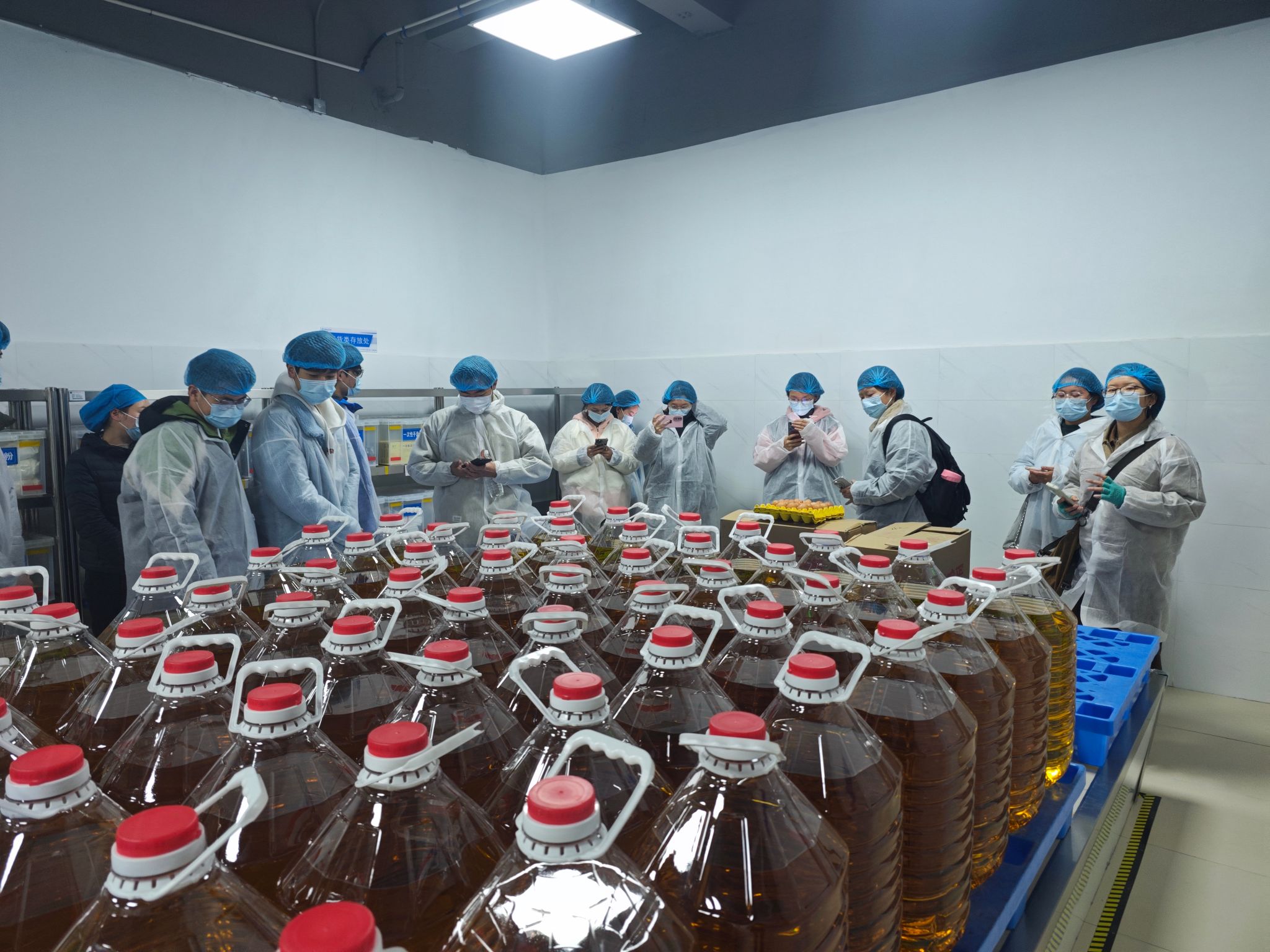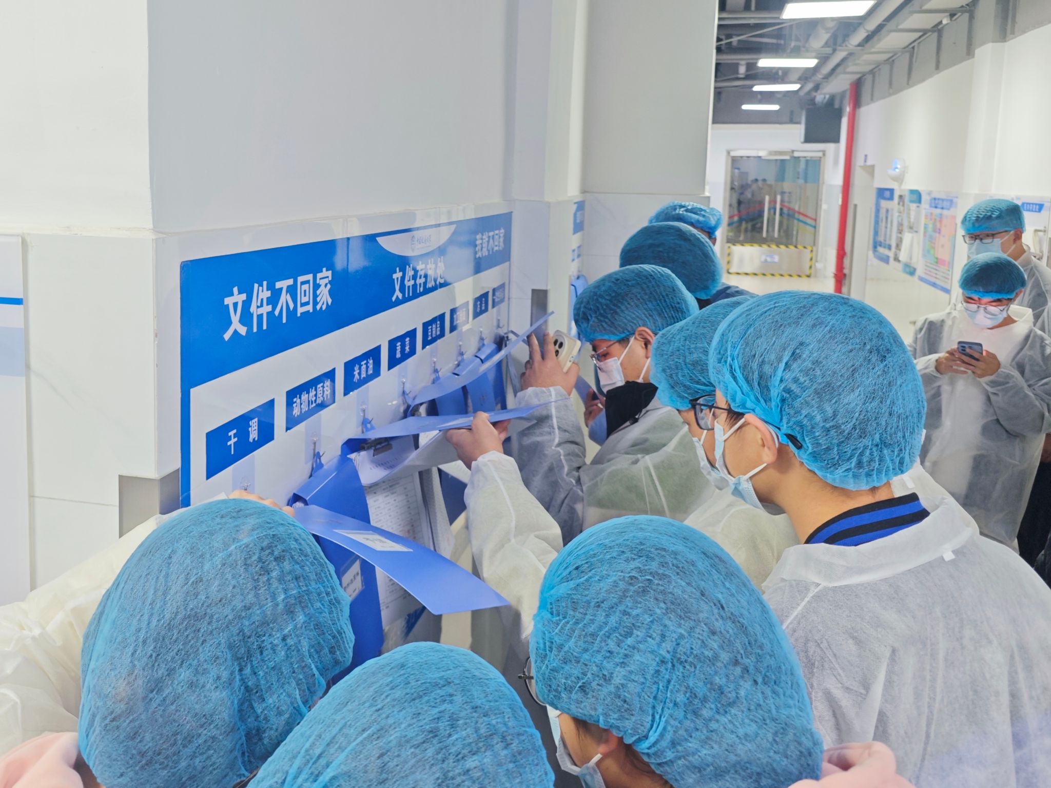 在北区食堂工作人员的全程引导下,同学们首先完成规范准入流程:依次穿戴好专用工作服、防尘头套与口罩,随后经由人员专用通道正式踏入后厨区域。一进门,饮食服务中心推行的“五全”现场管理规范便以可视化形式清晰呈现——全环节整理、全过程责任、全方位培训、全链条执行、全覆盖监管,每一项要求都深度融入后厨运作的细节之中。